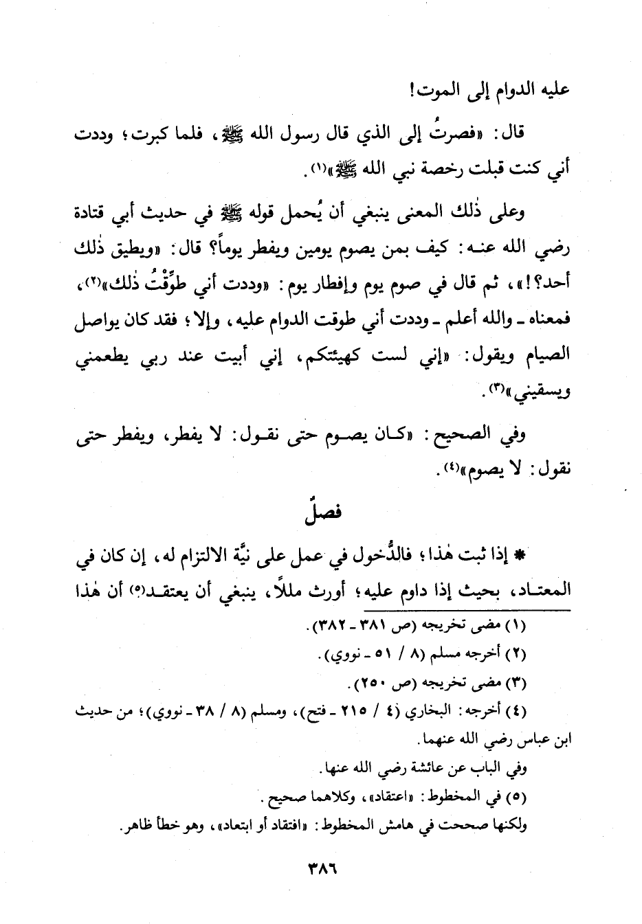 وَعَلَى ذَلِكَ الْمَعْنَى يَنْبَغِي أَنْ يُحْمَلَ قَوْلُهُ صَلَّى اللَّهُ عَلَيْهِ وَسَلَّمَ فِي حَدِيثِ أَبِي قَتَادَةَ رَضِيَ اللَّهُ عَنْهُ: كَيْفَ بِمَنْ يَصُومُ يَوْمَيْنِ وَيُفْطِرُ يَوْمًا؟ قَالَ: " وَيُطِيقُ أَحَدٌ ذَلِكَ؟! "، ثُمَّ قَالَ فِي صَوْمِ يَوْمٍ وَإِفْطَارِ يَوْمٍ: " وَدِدْتُ أَنِّي طُوِّقْتُ ذَلِكَ "، فَمَعْنَاهُ ـ وَاللَّهُ أَعْلَمُ ـ وَدِدْتُ أَنِّي طُوِّقْتُ الدَّوَامَ عَلَيْهِ، وَإِلَّا؛ فَقَدْ كَانَ يُوَاصِلُ الصِّيَامَ وَيَقُولُ: «إِنِّي لَسْتُ كَهَيْئَتِكُمْ، إِنِّي أَبَيْتُ عِنْدَ رَبِّي يُطْعِمُنِي وَيَسْقِينِي».