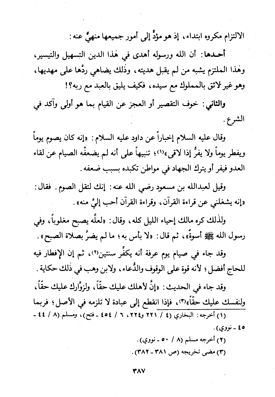 وَقَدْ جَاءَ فِي الْحَدِيثِ: «إِنَّ لِأَهْلِكَ عَلَيْكَ حَقًّا، وَلِزُوَّارِكَ عَلَيْكَ حَقًّا، وَلِنَفَسِكَ عَلَيْكَ حَقًّا»، فَإِذَا انْقَطَعَ إِلَى عِبَادَةٍ لَا تَلْزَمُهُ فِي الْأَصْلِ؛ فَرُبَّمَا