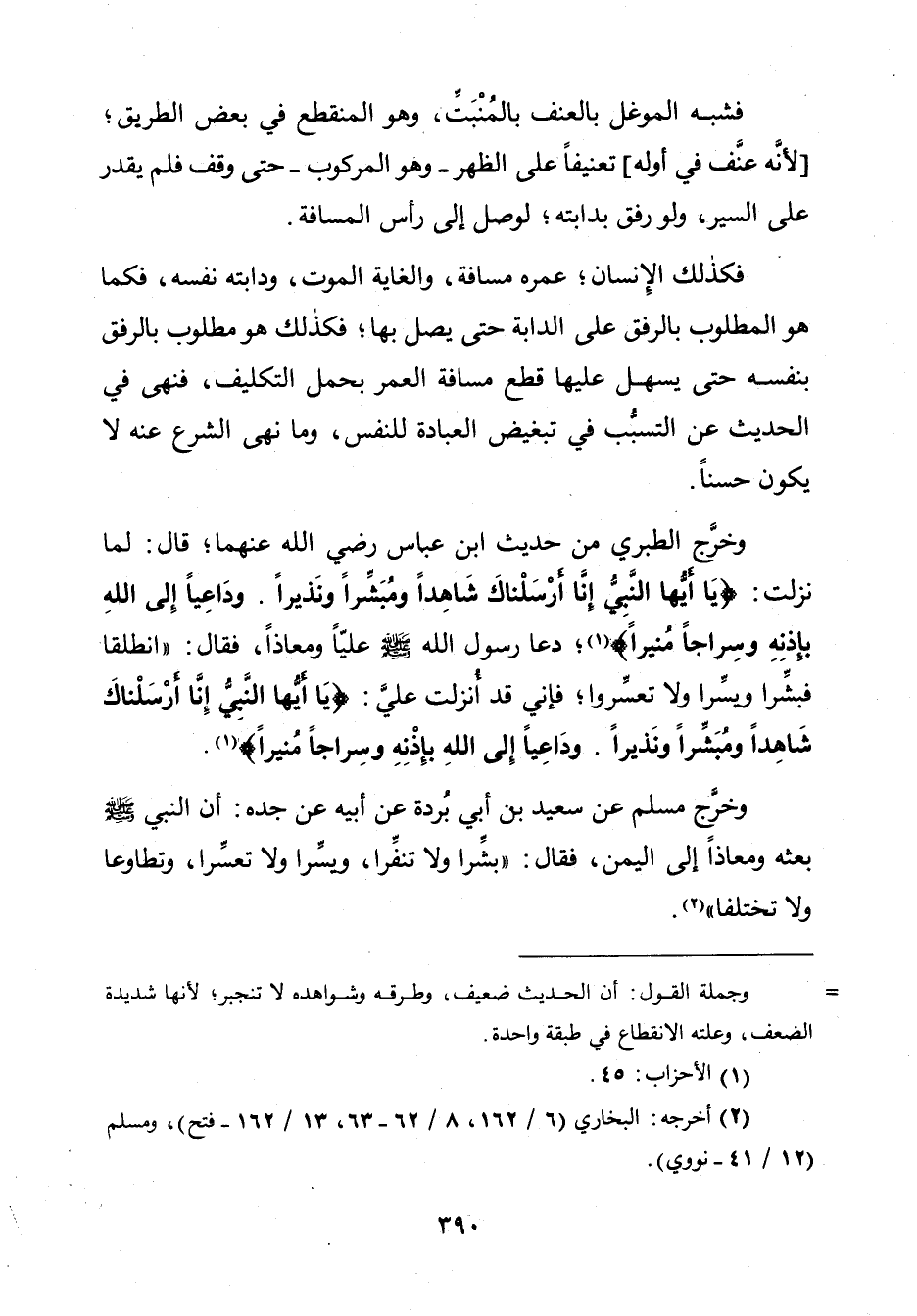 وَخَرَّجَ الطَّبَرَانِيُّ مِنْ حَدِيثِ ابْنِ عَبَّاسٍ رَضِيَ اللَّهُ عَنْهُمَا؛ قَالَ: «لَمَّا نَزَلَتْ: {يَاأَيُّهَا النَّبِيُّ إِنَّا أَرْسَلْنَاكَ شَاهِدًا وَمُبَشِّرًا وَنَذِيرًا - وَدَاعِيًا إِلَى اللَّهِ بِإِذْنِهِ وَسِرَاجًا مُنِيرًا} [الأحزاب: 45 - 46]، دَعَا رَسُولُ اللَّهِ صَلَّى اللَّهُ عَلَيْهِ وَسَلَّمَ عَلِيًّا وَمُعَاذًا، فَقَالَ: " انْطَلِقَا فَبَشِّرَا وَيَسِّرَا وَلَا تُعَسِّرَا؛ فَإِنِّي أُنْزِلَتْ عَلَيَّ: يَا أَيُّهَا النَّبِيُّ إِنَّا أَرْسَلْنَاكَ شَاهِدًا وَمُبَشِّرًا وَنَذِيرًا وَدَاعِيًا إِلَى اللَّهِ بِإِذْنِهِ وَسِرَاجًا مُنِيرًا».