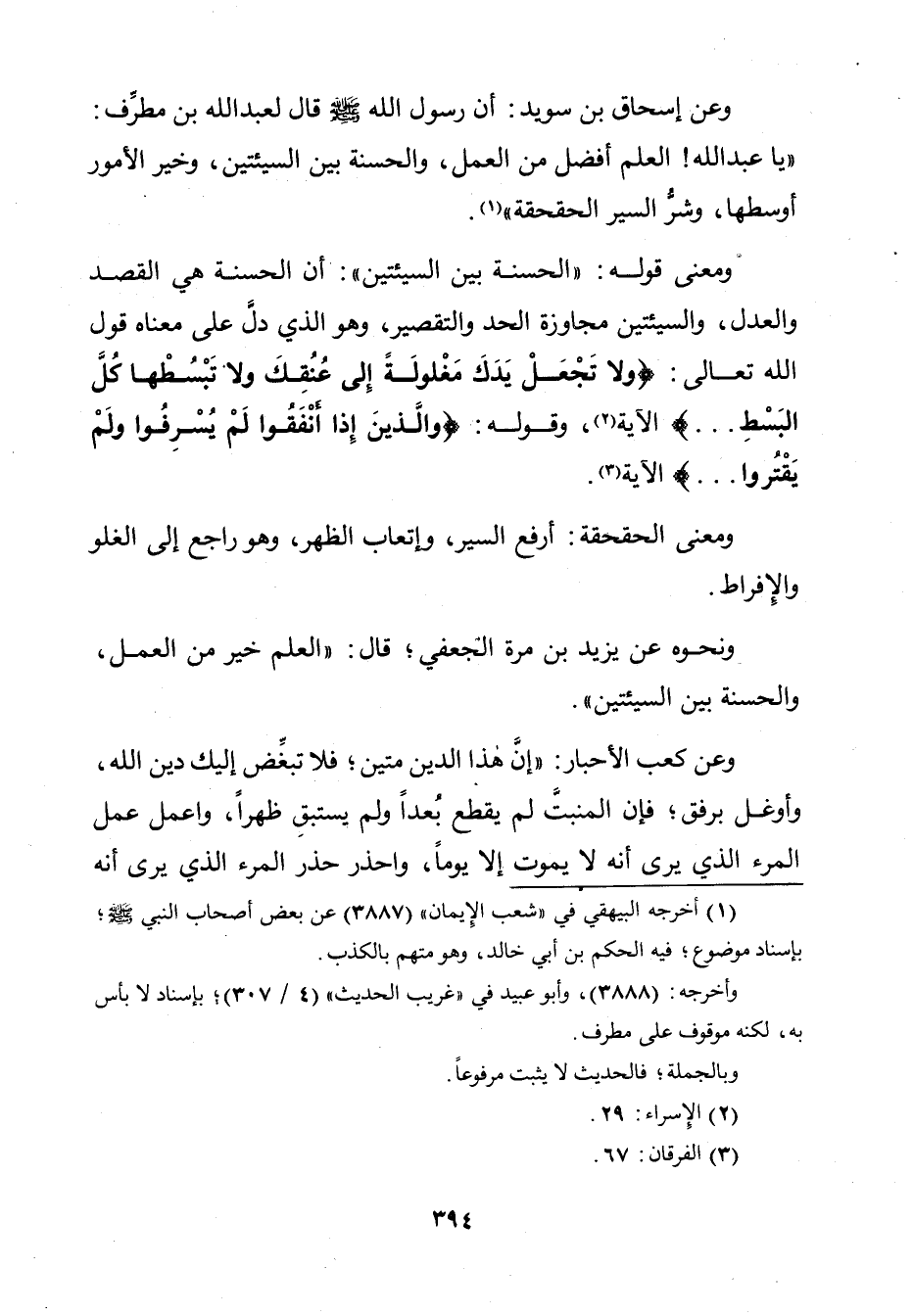 وَمَعْنَى قَوْلِهِ: إِنَّ «الْحَسَنَةَ بَيْنَ السَّيِّئَتَيْنِ»: أَنَّ الْحَسَنَةَ هِيَ الْقَصْدُ وَالْعَدْلُ، وَالسَّيِّئَتَيْنِ مُجَاوَزَةُ الْحَدِّ وَالتَّقْصِيرُ، وَهُوَ الَّذِي دَلَّ عَلَى مَعْنَاهُ قَوْلُ اللَّهِ تَعَالَى: {وَلَا تَجْعَلْ يَدَكَ مَغْلُولَةً إِلَى عُنُقِكَ وَلَا تَبْسُطْهَا كُلَّ الْبَسْطِ} [الإسراء: 29] الْآيَةَ، وَقَوْلُهُ: {وَالَّذِينَ إِذَا أَنْفَقُوا لَمْ يُسْرِفُوا وَلَمْ يَقْتُرُوا} [الفرقان: 67] الْآيَةَ.