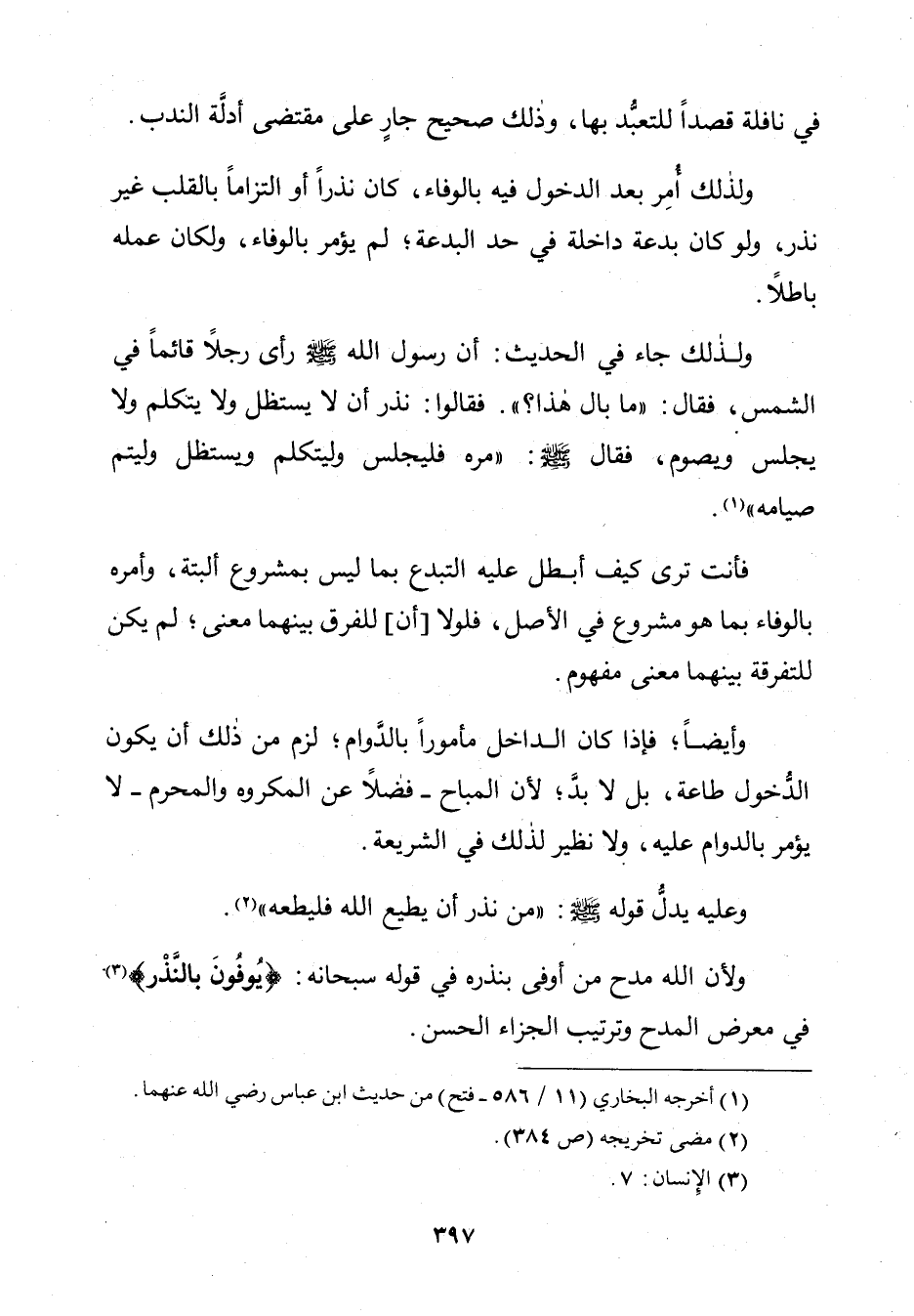 وَلِذَلِكَ جَاءَ فِي الْحَدِيثِ: أَنَّ رَسُولَ اللَّهِ صَلَّى اللَّهُ عَلَيْهِ وَسَلَّمَ «رَأَى رَجُلًا قَائِمًا فِي الشَّمْسِ، فَقَالَ: " مَا بَالُ هَذَا؟ "، فَقَالُوا: نَذَرَ أَنْ لَا يَسْتَظِلَّ وَلَا يَتَكَلَّمَ وَلَا يَجْلِسَ وَيَصُومَ، فَقَالَ صَلَّى اللَّهُ عَلَيْهِ وَسَلَّمَ: " مُرُوهُ فَلْيَجْلِسْ وَلْيَتَكَلَّمْ وَلْيَسْتَظِلَّ وَلْيُتِمَّ صِيَامَهُ».