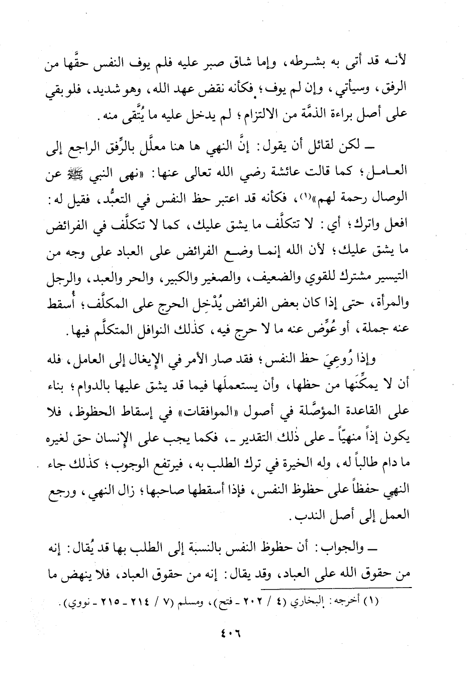 لَكِنْ لِقَائِلٍ أَنْ يَقُولَ: إِنَّ النَّهْيَ هَاهُنَا مُعَلَّقٌ بِالرِّفْقِ الرَّاجِعِ إِلَى الْعَامِلِ؛ كَمَا قَالَتْ عَائِشَةُ رَضِيَ اللَّهُ عَنْهَا: «نَهَى النَّبِيُّ صَلَّى اللَّهُ عَلَيْهِ وَسَلَّمَ عَنِ الْوِصَالِ رَحْمَةً لَهُمْ»، فَكَأَنَّهُ قَدِ اعْتَبَرَ حَظَّ النَّفْسِ فِي التَّعَبُّدِ، فَقِيلَ لَهُ: افْعَلْ وَاتْرُكْ؛ أَيْ: لَا تَتَكَلَّفْ مَا يَشُقُّ عَلَيْكَ، كَمَا لَا تَتَكَلَّفُ فِي الْفَرَائِضِ مَا يَشُقُّ عَلَيْكَ؛ لِأَنَّ اللَّهَ إِنَّمَا وَضَعَ الْفَرَائِضَ عَلَى الْعِبَادِ عَلَى وَجْهٍ مِنَ التَّيْسِيرِ مُشْتَرَكٍ لِلْقَوِيِّ وَالضَّعِيفِ، وَالصَّغِيرِ وَالْكَبِيرِ، وَالْحُرِّ وَالْعَبْدِ، وَالرَّجُلِ وَالْمَرْأَةِ، حَتَّى إِذَا كَانَ بَعْضُ الْفَرَائِضِ يُدْخِلُ الْحَرَجَ عَلَى الْمُكَلَّفِ؛ يَسْقُطُ عَنْهُ جُمْلَةً، أَوْ عُوِّضَ عَنْهُ مَا لَا حَرَجَ فِيهِ، كَذَلِكَ النَّوَافِلُ الْمُتَكَلَّمُ فِيهَا.