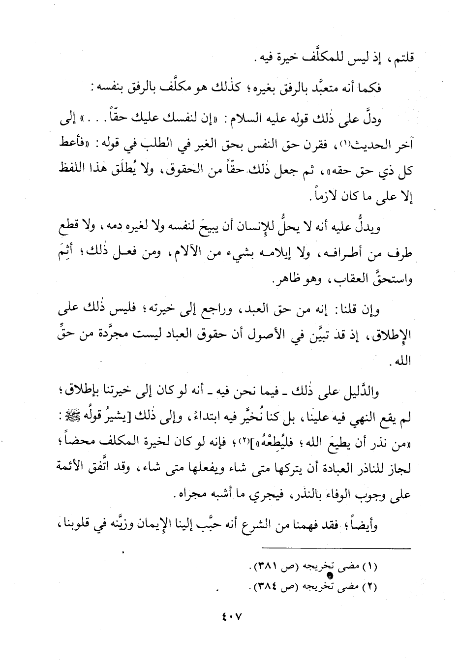 وَدَلَّ عَلَى ذَلِكَ قَوْلُهُ عَلَيْهِ السَّلَامُ: «إِنَّ لِنَفْسِكَ عَلَيْكَ حَقًّا. . .» إِلَى آخَرِ الْحَدِيثِ، فَقَرَنَ حَقَّ النَّفْسِ بِحَقِّ الْغَيْرِ فِي الطَّلَبِ فِي قَوْلِهِ: «فَأَعْطِ كُلَّ ذِي حَقٍّ حَقَّهُ»، ثُمَّ جَعَلَ ذَلِكَ حَقًّا مِنَ الْحُقُوقِ، وَلَا يُطْلَقُ هَذَا اللَّفْظُ إِلَّا عَلَى مَا كَانَ لَازِمًا.