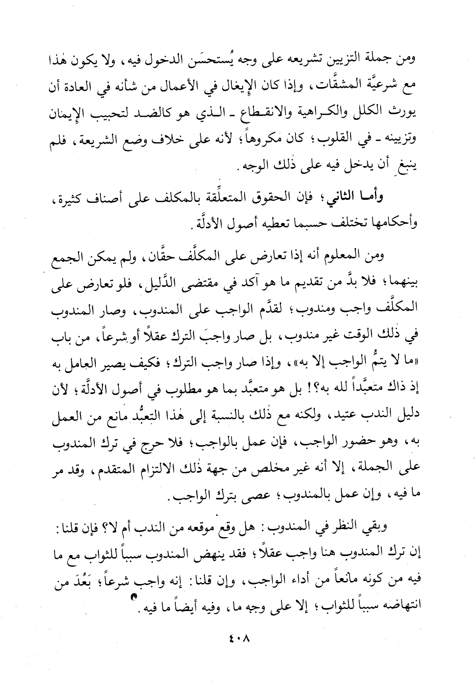 وَمِنَ الْمَعْلُومِ أَنَّهُ إِذَا تَعَارَضَ عَلَى الْمُكَلَّفِ حَقَّانِ، وَلَمْ يُمْكِنِ الْجَمْعُ بَيْنَهُمَا؛ فَلَا بُدَّ مِنْ تَقْدِيمِ مَا هُوَ آكَدُ فِي مُقْتَضَى الدَّلِيلِ، فَلَوْ تَعَارَضَ عَلَى الْمُكَلَّفِ وَاجِبٌ وَمَنْدُوبٌ؛ لَقَدَّمَ الْوَاجِبَ عَلَى الْمَنْدُوبِ، وَصَارَ الْمَنْدُوبُ فِي ذَلِكَ الْوَقْتِ غَيْرَ مَنْدُوبٍ، بَلْ صَارَ وَاجِبَ التَّرْكِ عَقْلًا أَوْ شَرْعًا، مِنْ " بَابِ مَا لَا يَتِمُّ الْوَاجِبُ إِلَّا بِهِ "، وَإِذَا صَارَ وَاجِبَ التَّرْكِ؛ فَكَيْفَ يَصِيرُ الْعَامِلُ بِهِ إِذْ ذَاكَ مُتَعَبِّدًا لِلَّهِ بِهِ؟! بَلْ هُوَ مُتَعَبِّدٌ بِمَا هُوَ مَطْلُوبٌ فِي أُصُولِ الْأَدِلَّةِ؛ لِأَنَّ دَلِيلَ النَّدْبِ عَتِيدٌ، وَلَكِنَّهُ مَعَ ذَلِكَ بِالنِّسْبَةِ إِلَى هَذَا التَّعَبُّدِ مَانِعٌ مِنَ الْعَمَلِ بِهِ، وَهُوَ حُضُورُ الْوَاجِبِ، فَإِنْ عَمِلَ بِالْوَاجِبِ؛ فَلَا حَرَجَ فِي تَرْكِ الْمَنْدُوبِ عَلَى الْجُمْلَةِ، إِلَّا أَنَّهُ غَيْرُ مُخْلِصٍ مِنْ جِهَةِ ذَلِكَ الِالْتِزَامِ الْمُتَقَدِّمِ، وَقَدْ مَرَّ مَا فِيهِ، وَإِنْ عَمِلَ بِالْمَنْدُوبِ؛ عَصَى بِتَرْكِ الْوَاجِبِ.