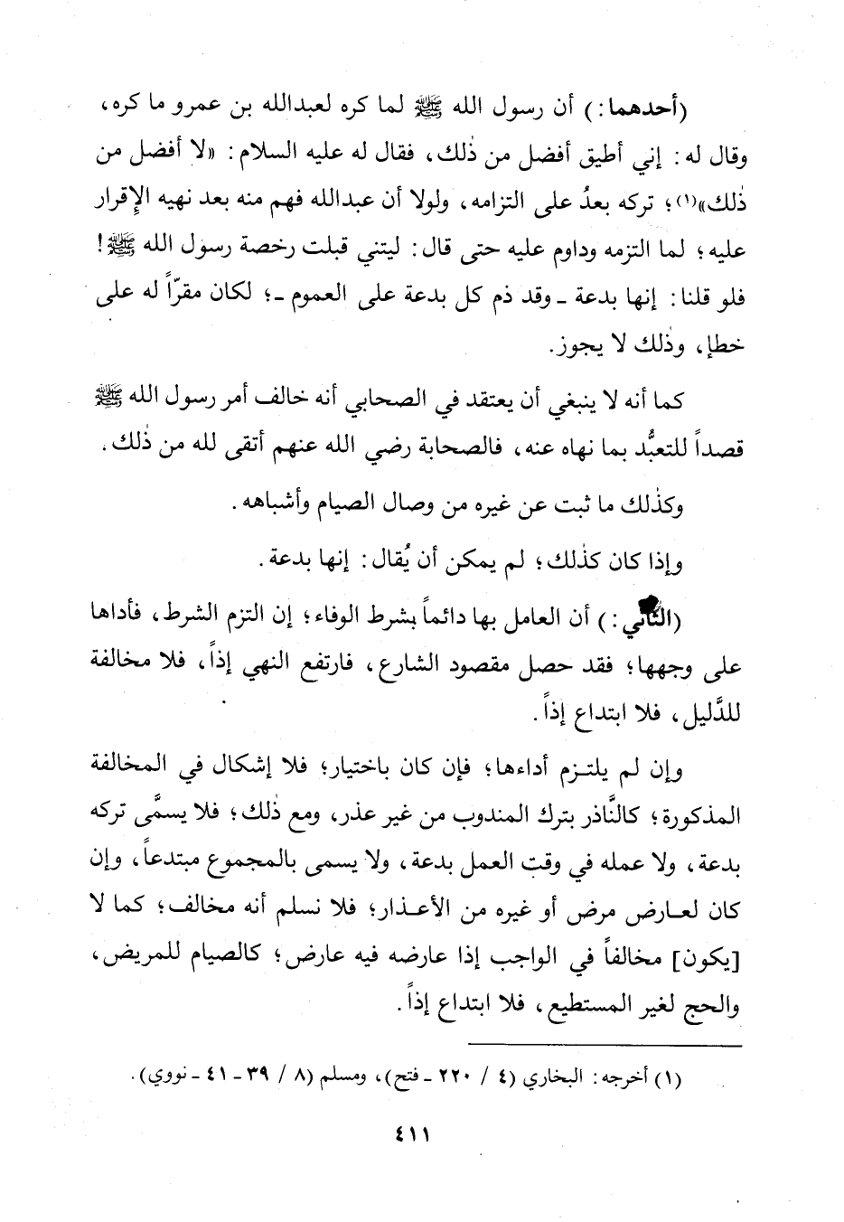 (أَحَدُهُمَا): أَنَّ رَسُولَ اللَّهِ صَلَّى اللَّهُ عَلَيْهِ وَسَلَّمَ لَمَّا كَرِهَ لِعَبْدِ اللَّهِ بْنِ عَمْرٍو مَا كَرِهَ، وَقَالَ لَهُ: «إِنِّي أُطِيقُ أَفْضَلَ مِنْ ذَلِكَ، فَقَالَ لَهُ عَلَيْهِ السَّلَامُ: لَا أَفْضَلَ مِنْ ذَلِكَ»؛ تَرَكَهُ بَعْدُ عَلَى الْتِزَامِهِ، وَلَوْلَا أَنَّ عَبْدَ اللَّهِ فَهِمَ مِنْهُ بَعْدَ نَهْيِهِ الْإِقْرَارَ عَلَيْهِ؛ لَمَا الْتَزَمَهُ وَدَاوَمَ عَلَيْهِ حَتَّى قَالَ: لَيْتَنِي قَبِلْتُ رُخْصَةَ رَسُولِ اللَّهِ صَلَّى اللَّهُ عَلَيْهِ وَسَلَّمَ! فَلَوْ قُلْنَا: إِنَّهَا بِدْعَةٌ ـ وَقَدْ ذُمَّ كُلُّ بِدْعَةٍ عَلَى الْعُمُومِ ـ؛ لَكَانَ مُقِرًّا لَهُ عَلَى خَطَأٍ، وَذَلِكَ لَا يَجُوزُ.