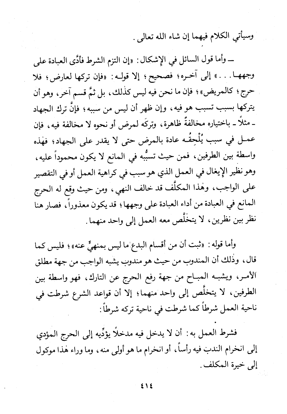 - وَأَمَّا قَوْلُ السَّائِلِ فِي الْإِشْكَالِ: " إِنِ الْتَزَمَ الشَّرْطَ فَأَدَّى الْعِبَادَةَ عَلَى وَجْهِهَا. . . " إِلَى آخِرِهِ؛ فَصَحِيحٌ؛ إِلَّا قَوْلَهُ: " فَإِنْ تَرَكَهَا لِعَارِضٍ؛ فَلَا حَرَجَ؛ كَالْمَرِيضِ "؛ فَإِنَّ مَا نَحْنُ فِيهِ لَيْسَ كَذَلِكَ، بَلْ ثَمَّ قِسْمٌ آخَرُ، وَهُوَ أَنْ يَتْرُكَهَا بِسَبَبٍ تَسَبَّبَ هُوَ فِيهِ، وَإِنْ ظَهَرَ أَنْ لَيْسَ مِنْ سَبَبِهِ؛ فَإِنَّ تَرْكَ الْجِهَادِ ـ مَثَلًا ـ بِاخْتِيَارِهِ مُخَالَفَةٌ ظَاهِرَةٌ، وَتَرْكَهُ لِمَرَضٍ أَوْ نَحْوِهِ لَا مُخَالَفَةَ فِيهِ، فَإِنْ عَمِلَ فِي سَبَبٍ يُلْحِقُهُ عَادَةً بِالْمَرِيضِ حَتَّى لَا يَقْدِرَ عَلَى الْجِهَادِ؛ فَهَذِهِ وَاسِطَةٌ بَيْنَ الطَّرَفَيْنِ، فَمِنْ حَيْثُ تَسَبُّبُهُ فِي الْمَانِعِ لَا يَكُونُ مَحْمُودًا عَلَيْهِ، وَهُوَ نَظِيرُ الْإِيغَالِ فِي الْعَمَلِ الَّذِي هُوَ سَبَبٌ فِي كَرَاهِيَةِ الْعَمَلِ أَوْ فِي التَّقْصِيرِ عَلَى الْوَاجِبِ، وَهَذَا الْمُكَلَّفُ قَدْ خَالَفَ النَّهْيَ، وَمِنْ حَيْثُ وَقَعَ لَهُ الْحَرَجُ الْمَانِعُ فِي الْعِبَادَةِ مِنْ أَدَائِهَا عَلَى وَجْهِهَا؛ قَدْ يَكُونُ مَعْذُورًا، فَصَارَ هُنَا نَظَرٌ بَيْنَ نَظَرَيْنِ، لَا يَتَخَلَّصُ مَعَهُ الْعَمَلُ إِلَى وَاحِدٍ مِنْهُمَا.