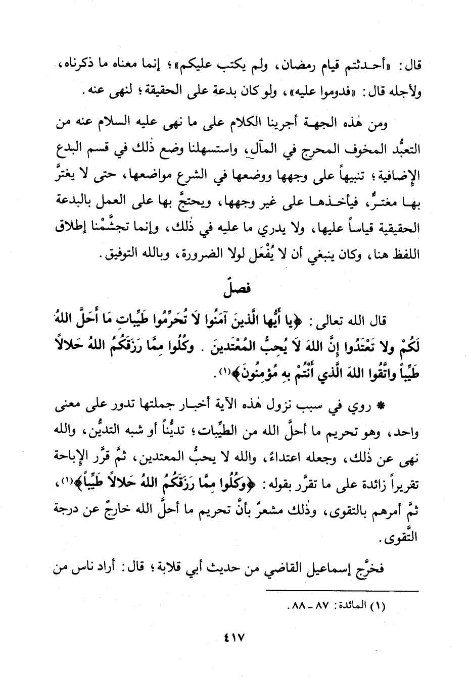 قَالَ اللَّهُ تَعَالَى: {يَاأَيُّهَا الَّذِينَ آمَنُوا لَا تُحَرِّمُوا طَيِّبَاتِ مَا أَحَلَّ اللَّهُ لَكُمْ وَلَا تَعْتَدُوا إِنَّ اللَّهَ لَا يُحِبُّ الْمُعْتَدِينَ - وَكُلُوا مِمَّا رَزَقَكُمُ اللَّهُ حَلَالًا طَيِّبًا وَاتَّقُوا اللَّهَ الَّذِي أَنْتُمْ بِهِ مُؤْمِنُونَ} [المائدة: 87 - 88].