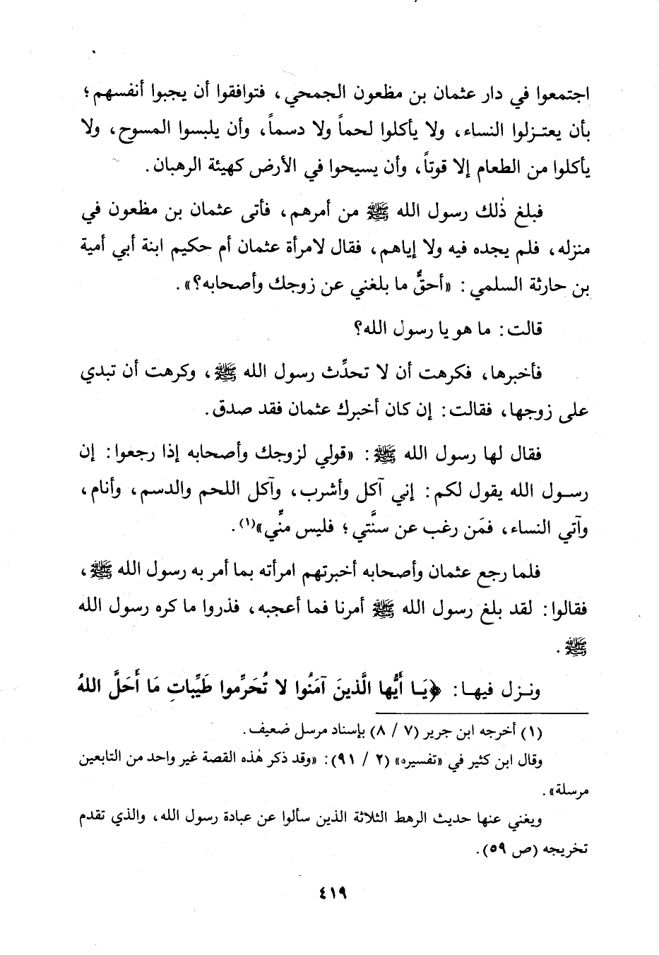 وَنَزَلَ فِيهَا: {يَاأَيُّهَا الَّذِينَ آمَنُوا لَا تُحَرِّمُوا طَيِّبَاتِ مَا أَحَلَّ اللَّهُ لَكُمْ} [المائدة: 87]»