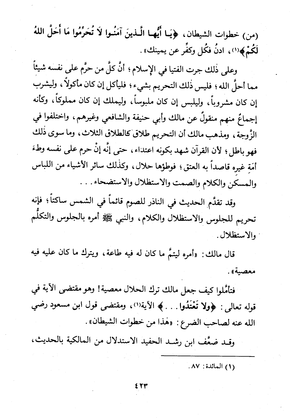 فَتَأَمَّلُوا كَيْفَ جَعَلَ مَالِكٌ تَرْكَ الْحَلَالِ مَعْصِيَةً! وَهُوَ مُقْتَضَى الْآيَةِ فِي قَوْلِهِ تَعَالَى: {وَلَا تَعْتَدُوا} [البقرة: 190] الْآيَةَ، وَمُقْتَضَى قَوْلِ ابْنِ مَسْعُودٍ رَضِيَ اللَّهُ عَنْهُ لِصَاحِبِ الضَّرْعِ: " هَذَا مِنْ خُطُوَاتِ الشَّيْطَانِ ".