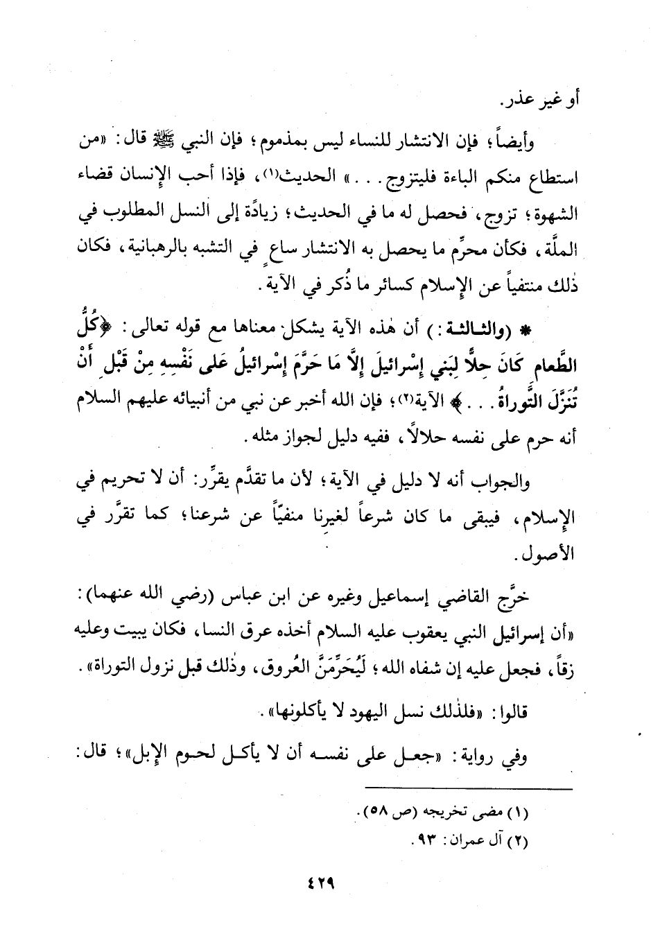 وَأَيْضًا؛ فَإِنَّ الِانْتِشَارَ لِلنِّسَاءِ لَيْسَ بِمَذْمُومٍ؛ فَإِنَّ النَّبِيَّ صَلَّى اللَّهُ عَلَيْهِ وَسَلَّمَ قَالَ: «مَنِ اسْتَطَاعَ مِنْكُمُ الْبَاءَةَ فَلْيَتَزَوَّجْ». . . الْحَدِيثَ، فَإِذَا أَحَبَّ الْإِنْسَانُ قَضَاءَ الشَّهْوَةِ؛ تَزَوَّجَ فَحَصَلَ لَهُ مَا فِي الْحَدِيثِ؛ زِيَادَةً إِلَى النَّسْلِ الْمَطْلُوبِ فِي الْمِلَّةِ، فَكَأَنَّ مُحَرِّمَ مَا يَحْصُلُ بِهِ الِانْتِشَارُ سَاعٍ فِي التَّشَبُّهِ بِالرَّهْبَانِيَّةِ، وَكَانَ ذَلِكَ مُنْتَفِيًا عَنِ الْإِسْلَامِ كَسَائِرِ مَا ذُكِرَ فِي الْآيَةِ.