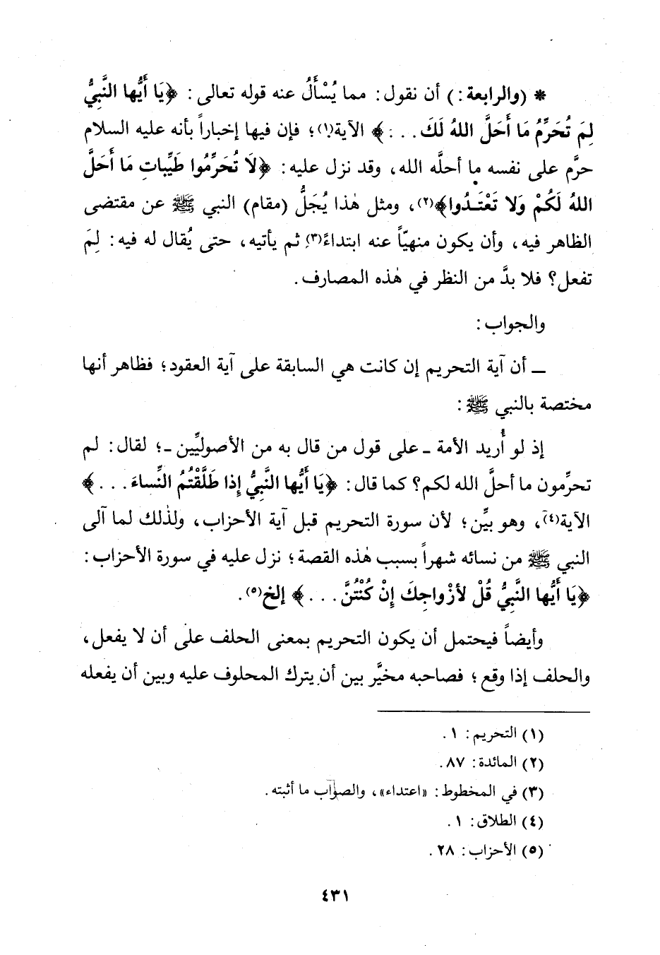 (الرَّابِعَةُ): أَنْ نَقُولَ: مِمَّا يُسْأَلُ عَنْهُ قَوْلُهُ تَعَالَى: {يَا أَيُّهَا النَّبِيُّ لِمَ تُحَرِّمُ مَا أَحَلَّ اللَّهُ لَكَ} [التحريم: 1]، الْآيَةَ؛ فَإِنَّ فِيهَا إِخْبَارًا بِأَنَّهُ عَلَيْهِ الصَّلَاةُ وَالسَّلَامُ حَرَّمَ عَلَى نَفْسِهِ مَا أَحَلَّهُ اللَّهُ، وَقَدْ نَزَلَ عَلَيْهِ: {لَا تُحَرِّمُوا طَيِّبَاتِ مَا أَحَلَّ اللَّهُ لَكُمْ وَلَا تَعْتَدُوا} [المائدة: 87]، وَمِثْلُ هَذَا يُجَلُّ (مَقَامُ) النَّبِيِّ صَلَّى اللَّهُ عَلَيْهِ وَسَلَّمَ عَنْ مُقْتَضَى الظَّاهِرِ فِيهِ، وَأَنْ يَكُونَ مَنْهِيًّا عَنْهُ ابْتِدَاءً ثُمَّ يَأْتِيهِ، حَتَّى يُقَالَ لَهُ فِيهِ: لِمَ تَفْعَلْ؟ فَلَا بُدَّ مِنَ النَّظَرِ فِي هَذِهِ الْمَصَارِفِ.
