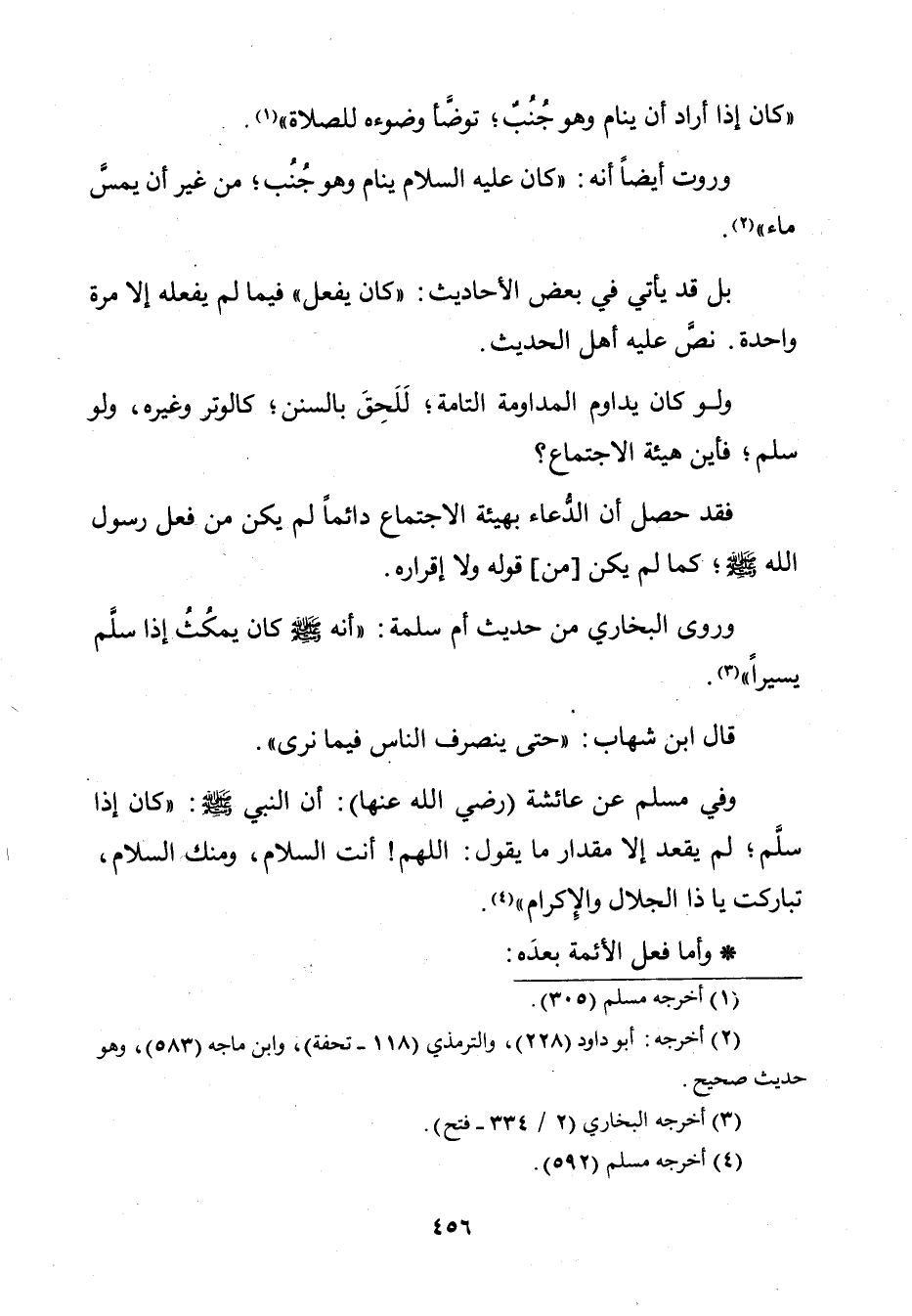 وَفِي مُسْلِمٍ عَنْ عَائِشَةَ (رَضِيَ اللَّهُ عَنْهَا): «أَنَّ النَّبِيَّ صَلَّى اللَّهُ عَلَيْهِ وَسَلَّمَ: كَانَ إِذَا سَلَّمَ؛ لَمْ يَقْعُدْ إِلَّا مِقْدَارَ مَا يَقُولُ: اللَّهُمَّ! أَنْتَ السَّلَامُ، وَمِنْكَ السَّلَامُ، تَبَارَكَتْ يَا ذَا الْجَلَالِ وَالْإِكْرَامِ».