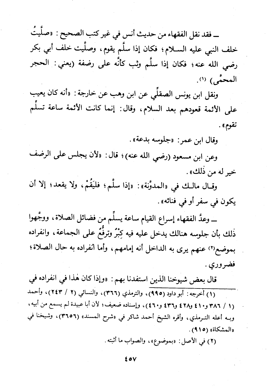 فَقَدْ نَقَلَ الْفُقَهَاءُ مِنْ حَدِيثِ أَنَسٍ فِي غَيْرِ كُتُبِ الصَّحِيحِ: " «صَلَّيْتُ خَلْفَ النَّبِيِّ عَلَيْهِ السَّلَامُ، فَكَانَ إِذَا سَلَّمَ يَقُومُ، وَصَلَّيْتُ خَلَفَ أَبِي بَكْرٍ رَضِيَ اللَّهُ عَنْهُ؛ فَكَانَ إِذَا سَلَّمَ وَثَبَ كَأَنَّهُ عَلَى رَضْفَةٍ» (يَعْنِي: الْحَجَرَ الْمُحَمَّى).