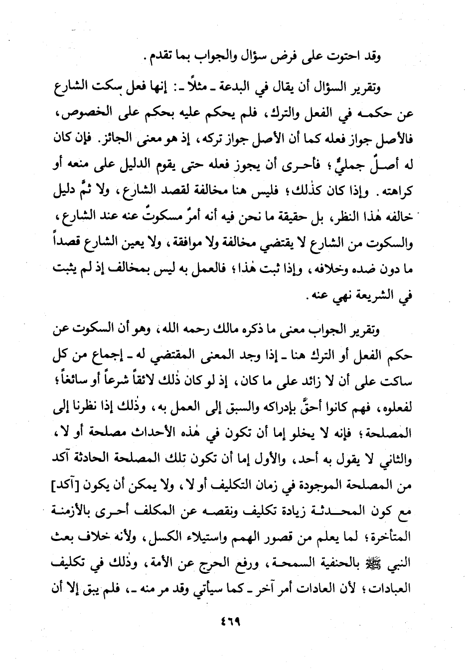 وَتَقْرِيرُ الْجَوَابِ: مَعْنَى مَا ذَكَرَهُ مَالِكٌ رَحِمَهُ اللَّهُ، وَهُوَ أَنَّ السُّكُوتَ عَنْ حُكْمِ الْفِعْلِ أَوِ التَّرْكِ هُنَا ـ إِذَا وُجِدَ الْمَعْنَى الْمُقْتَضِي لَهُ ـ إِجْمَاعٌ مِنْ كُلِّ سَاكِتٍ عَلَى أَنْ لَا زَائِدَ عَلَى مَا كَانَ، إِذْ لَوْ كَانَ ذَلِكَ لَائِقًا شَرْعًا أَوْ سَائِغًا؛ لَفَعَلُوهُ، فَهُمْ كَانُوا أَحَقَّ بِإِدْرَاكِهِ وَالسَّبْقِ إِلَى الْعَمَلِ بِهِ، وَذَلِكَ إِذَا نَظَرْنَا إِلَى الْمَصْلَحَةِ؛ فَإِنَّهُ لَا يَخْلُو إِمَّا أَنْ يَكُونَ فِي هَذِهِ الْأَحْدَاثِ مَصْلَحَةٌ أَوْ لَا، وَالثَّانِي لَا يَقُولُ بِهِ أَحَدٌ، وَالْأَوَّلُ إِمَّا أَنْ تَكُونَ تِلْكَ الْمَصْلَحَةُ الْحَادِثَةُ آكَدَ مِنَ الْمَصْلَحَةِ الْمَوْجُودَةِ فِي زَمَانِ التَّكْلِيفِ أَوْ لَا، وَلَا يُمْكِنُ أَنْ يَكُونَ [آكَدَ] مَعَ كَوْنِ الْمُحْدَثَةِ زِيَادَةَ تَكْلِيفٍ وَنَقْصُهُ عَنِ الْمُكَلَّفِ أَحْرَى بِالْأَزْمِنَةِ الْمُتَأَخِّرَةِ؛ لِمَا يُعْلَمُ مِنْ قُصُورِ الْهِمَمِ وَاسْتِيلَاءِ الْكَسَلِ، وَلِأَنَّهُ خِلَافُ بَعْثِ النَّبِيِّ صَلَّى اللَّهُ عَلَيْهِ وَسَلَّمَ بِالْحَنَفِيَّةِ السَّمْحَةِ، وَرَفْعِ الْحَرَجِ عَنِ الْأُمَّةِ، وَذَلِكَ فِي تَكْلِيفِ الْعِبَادَاتِ؛ لِأَنَّ الْعَادَاتِ أَمْرٌ آخَرُ ـ كَمَا سَيَأْتِي وَقَدْ مَرَّ مِنْهُ ـ، فَلَمْ يَبْقَ إِلَّا أَنْ