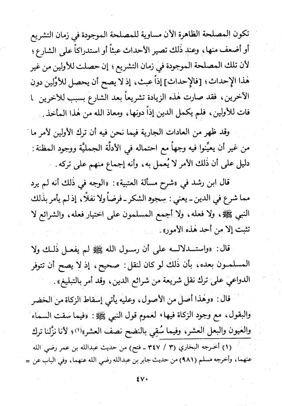 قَالَ: " وَهَذَا أَصْلٌ مِنَ الْأُصُولِ، وَعَلَيْهِ يَأْتِي إِسْقَاطُ الزَّكَاةِ مِنَ الْخُضَرِ وَالْبُقُولِ، مَعَ وُجُودِ الزَّكَاةِ فِيهَا، لِعُمُومِ قَوْلِ النَّبِيِّ صَلَّى اللَّهُ عَلَيْهِ وَسَلَّمَ: «فِيمَا سَقْتِ السَّمَاءُ وَالْعُيُونُ وَالْبَعْلُ الْعُشْرُ، وَفِيمَا سُقِيَ بِالنَّضْحِ نِصْفُ الْعُشْرِ»، لِأَنَّا نَزَّلْنَا تَرْكَ
