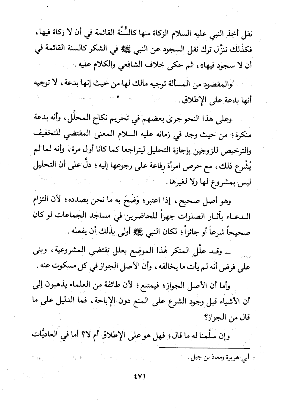 نَقْلِ أَخْذِ النَّبِيِّ عَلَيْهِ السَّلَامُ الزَّكَاةَ مِنْهَا كَالسُّنَّةِ الْقَائِمَةِ فِي أَنْ لَا زَكَاةَ فِيهَا، فَكَذَلِكَ نَزَلَ تَرْكُ نَقْلِ السُّجُودِ عَنِ النَّبِيِّ صَلَّى اللَّهُ عَلَيْهِ وَسَلَّمَ فِي الشُّكْرِ كَالسُّنَّةِ الْقَائِمَةِ فِي أَنْ لَا سُجُودَ فِيهَا "، ثُمَّ حَكَى خِلَافَ الشَّافِعِيِّ وَالْكَلَامَ عَلَيْهِ.