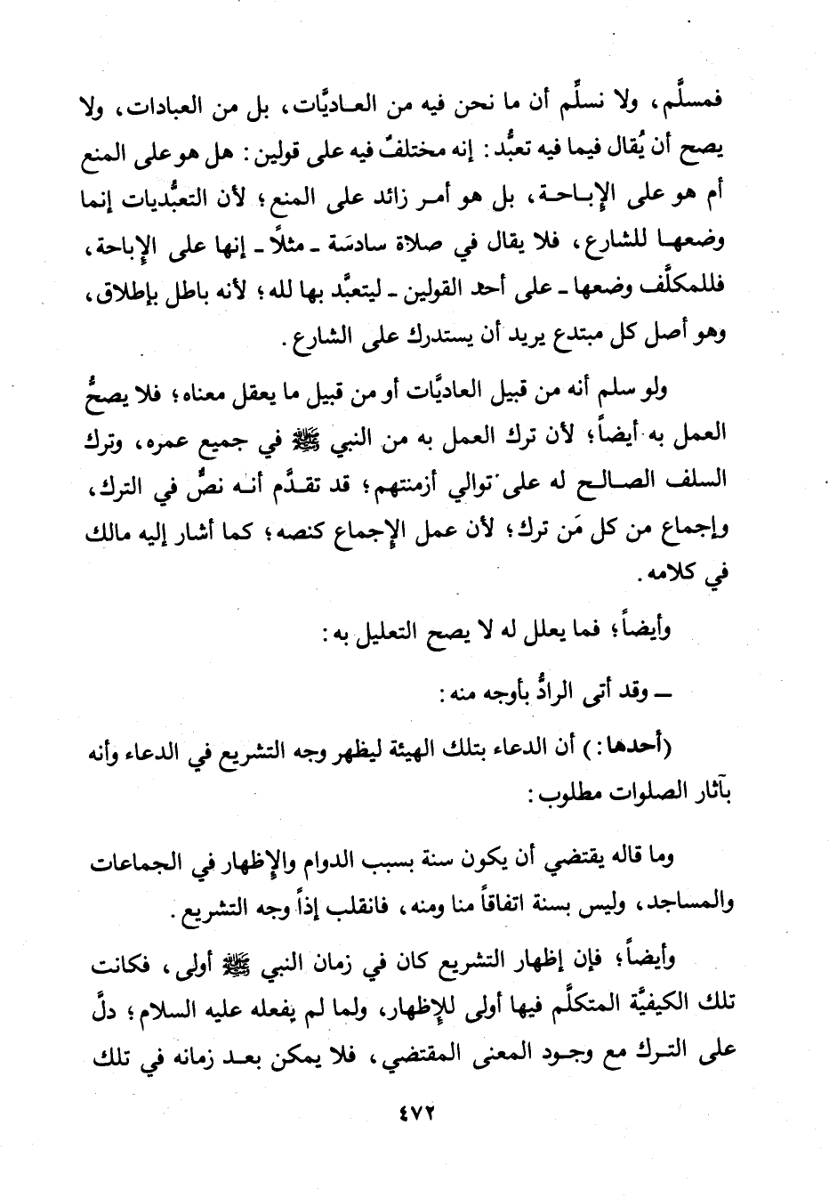 وَلَوْ سُلِّمَ أَنَّهُ مِنْ قَبِيلِ الْعَادِيَّاتِ أَوْ مِنْ قَبِيلِ مَا يُعْقَلُ مَعْنَاهُ؛ فَلَا يَصِحُّ الْعَمَلُ بِهِ أَيْضًا؛ لِأَنَّ تَرْكَ الْعَمَلِ بِهِ مِنَ النَّبِيِّ صَلَّى اللَّهُ عَلَيْهِ وَسَلَّمَ فِي جَمِيعِ عُمُرِهِ، وَتَرْكَ السَّلَفِ الصَّالِحِ لَهُ عَلَى تَوَالِي أَزْمِنَتِهِمْ؛ قَدْ تَقَدَّمَ أَنَّهُ نَصٌّ فِي التَّرْكِ، وَإِجْمَاعٌ مِنْ كُلِّ مَنْ تَرَكَ؛ لِأَنَّ عَمَلَ الْإِجْمَاعِ كَنَصِّهِ؛ كَمَا أَشَارَ مَالِكٌ فِي كَلَامِهِ.