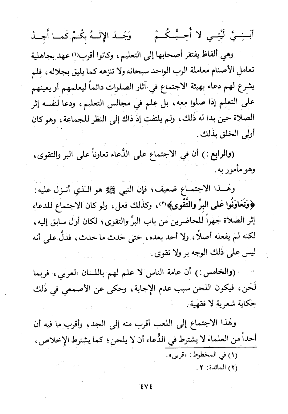 (وَالرَّابِعُ): أَنَّ فِي الِاجْتِمَاعِ عَلَى الدُّعَاءِ تَعَاوُنًا عَلَى الْبِرِّ وَالتَّقْوَى، وَهُوَ مَأْمُورٌ بِهِ.