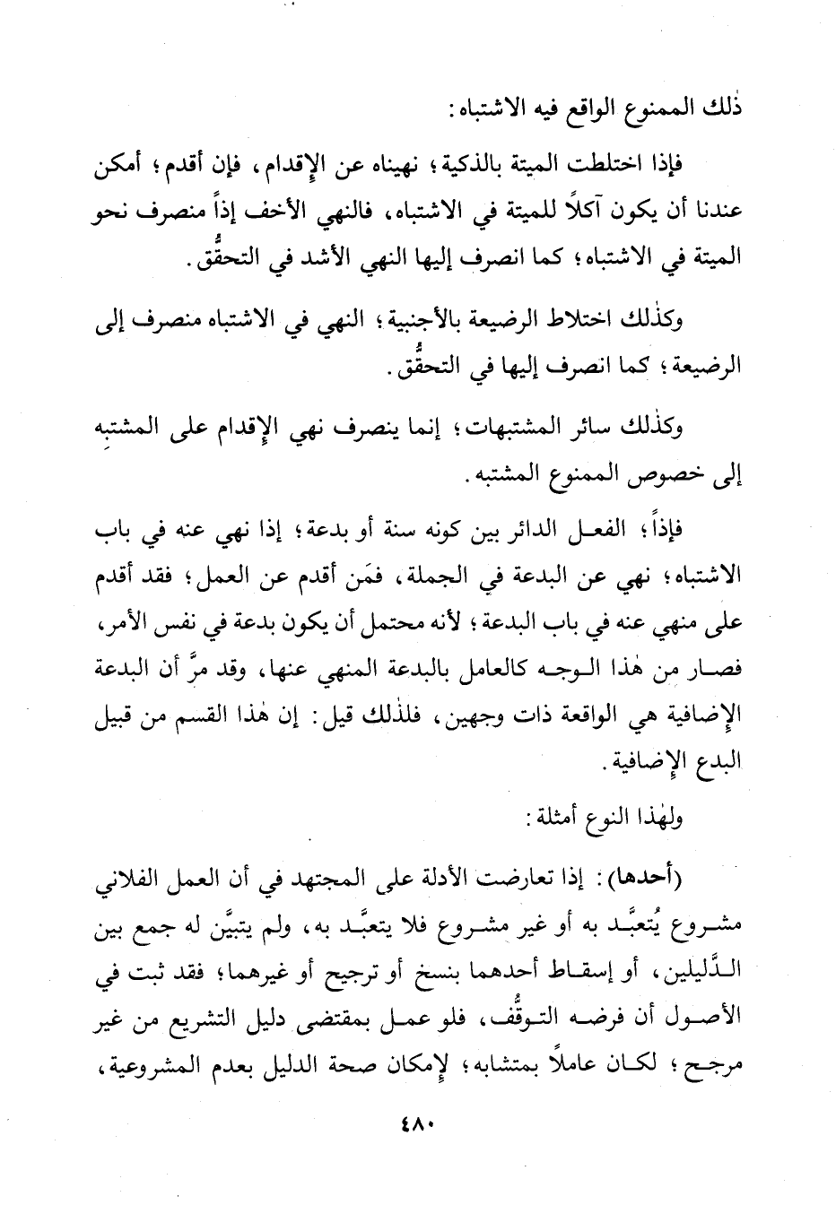وَكَذَلِكَ سَائِرُ الْمُشْتَبِهَاتِ؛ إِنَّمَا يَنْصَرِفُ نَهْيُ الْإِقْدَامِ عَلَى الْمُشْتَبَهِ إِلَى خُصُوصِ الْمَمْنُوعِ الْمُشْتَبَهِ.