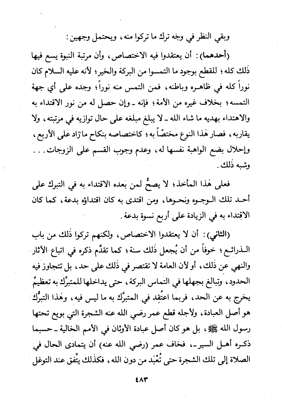 (الثَّانِي): أَنْ لَا يَعْتَقِدُوا الِاخْتِصَاصَ، وَلَكِنَّهُمْ تَرَكُوا ذَلِكَ مِنْ بَابِ الذَّرَائِعِ؛ خَوْفًا مِنْ أَنْ يُجْعَلَ ذَلِكَ سُنَّةً؛ كَمَا تَقَدَّمَ ذِكْرُهُ فِي اتِّبَاعِ الْآثَارِ وَالنَّهْيِ عَنْ ذَلِكَ، أَوْ لِأَنَّ الْعَامَّةَ لَا تَقْتَصِرُ فِي ذَلِكَ عَلَى حَدٍّ، بَلْ تَتَجَاوَزُ فِيهِ الْحُدُودَ، وَتُبَالِغُ بِجَهْلِهَا فِي الْتِمَاسِ الْبَرَكَةِ، حَتَّى يُدَاخِلَهَا لِلْمُتَبَرَّكِ بِهِ تَعْظِيمٌ يَخْرُجُ بِهِ عَنِ الْحَدِّ، فَرُبَّمَا اعْتَقَدَ فِي الْمُتَبَرَّكِ بِهِ مَا لَيْسَ فِيهِ، وَهَذَا التَّبَرُّكُ هُوَ أَصْلُ الْعِبَادَةِ، وَلِأَجَلِهِ قَطَعَ عُمَرُ رَضِيَ اللَّهُ عَنْهُ الشَّجَرَةَ الَّتِي بُويِعَ تَحْتَهَا رَسُولُ اللَّهِ صَلَّى اللَّهُ عَلَيْهِ وَسَلَّمَ، بَلْ هُوَ كَانَ أَصْلَ عِبَادَةِ الْأَوْثَانِ فِي الْأُمَمِ الْخَالِيَةِ ـ حَسْبَمَا ذَكَرَهُ أَهْلُ السِّيَرِ ـ، فَخَافَ عُمَرُ (رَضِيَ اللَّهُ عَنْهُ) أَنْ يَتَمَادَى الْحَالُ فِي الصَّلَاةِ إِلَى تِلْكَ الشَّجَرَةِ حَتَّى تُعْبَدَ مِنْ دُونِ اللَّهِ، فَكَذَلِكَ يَتَّفِقُ عِنْدَ التَّوَغُّلِ