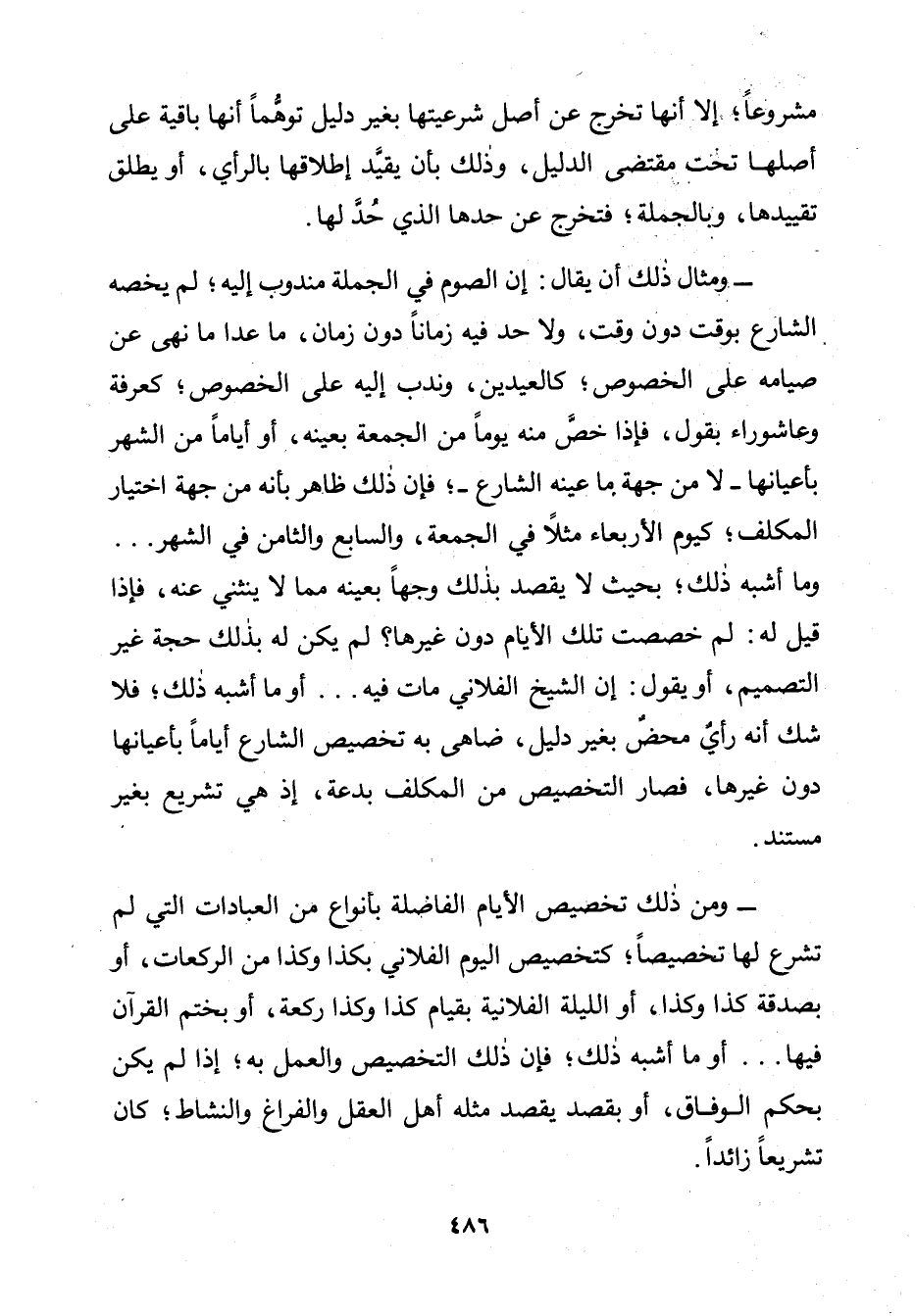 وَمِثَالُ ذَلِكَ أَنْ يُقَالَ: إِنَّ الصَّوْمَ فِي الْجُمْلَةِ مَنْدُوبٌ إِلَيْهِ؛ لَمْ يَخُصَّهُ الشَّارِعُ بِوَقْتٍ دُونَ وَقْتٍ، وَلَا حَدٍّ فِيهِ زَمَانًا دُونَ زَمَانٍ، مَا عَدَّا مَا نُهِيَ عَنْ صِيَامِهِ عَلَى الْخُصُوصِ؛ كَالْعِيدَيْنِ، وَنُدِبَ إِلَيْهِ عَلَى الْخُصُوصِ؛ كَعَرَفَةَ وَعَاشُورَاءَ بِقَوْلٍ، فَإِذَا خَصَّ مِنْهُ يَوْمًا مِنَ الْجُمْعَةِ بِعَيْنِهِ، أَوْ أَيَّامًا مِنَ الشَّهْرِ بِأَعْيَانِهَا ـ لَا مِنْ جِهَةِ مَا عَيَّنَهُ الشَّارِعُ ـ؛ فَإِنَّ ذَلِكَ ظَاهِرٌ بِأَنَّهُ مِنْ جِهَةِ اخْتِيَارِ الْمُكَلَّفِ؛ كَيَوْمِ الْأَرْبِعَاءَ مَثَلًا فِي الْجُمْعَةِ، وَالسَّابِعِ وَالثَّامِنِ فِي الشَّهْرِ. . . وَمَا أَشْبَهَ ذَلِكَ؛ بِحَيْثُ لَا يَقْصِدُ بِذَلِكَ وَجْهًا بِعَيْنِهِ مِمَّا لَا يَنْثَنِي عَنْهُ، فَإِذَا قِيلَ لَهُ: لِمَ خَصَّصَتْ تِلْكَ الْأَيَّامَ دُونَ غَيْرِهَا؟ لَمْ يَكُنْ لَهُ بِذَلِكَ حُجَّةٌ غَيْرَ التَّصْمِيمِ، أَوْ يَقُولُ: إِنَّ الشَّيْخَ الْفُلَانِيَّ مَاتَ فِيهِ. . . أَوْ مَا أَشْبَهَ ذَلِكَ؛ فَلَا شَكَّ أَنَّهُ رَأْيٌ مَحْضٌ بِغَيْرِ دَلِيلٍ، ضَاهَى بِهِ تَخْصِيصَ الشَّارِعِ أَيَّامًا بِأَعْيَانِهَا دُونَ غَيْرِهَا، فَصَارَ التَّخْصِيصُ مِنَ الْمُكَلَّفِ بِدْعَةً، إِذْ هِيَ تَشْرِيعٌ بِغَيْرِ مُسْتَنَدٍ.