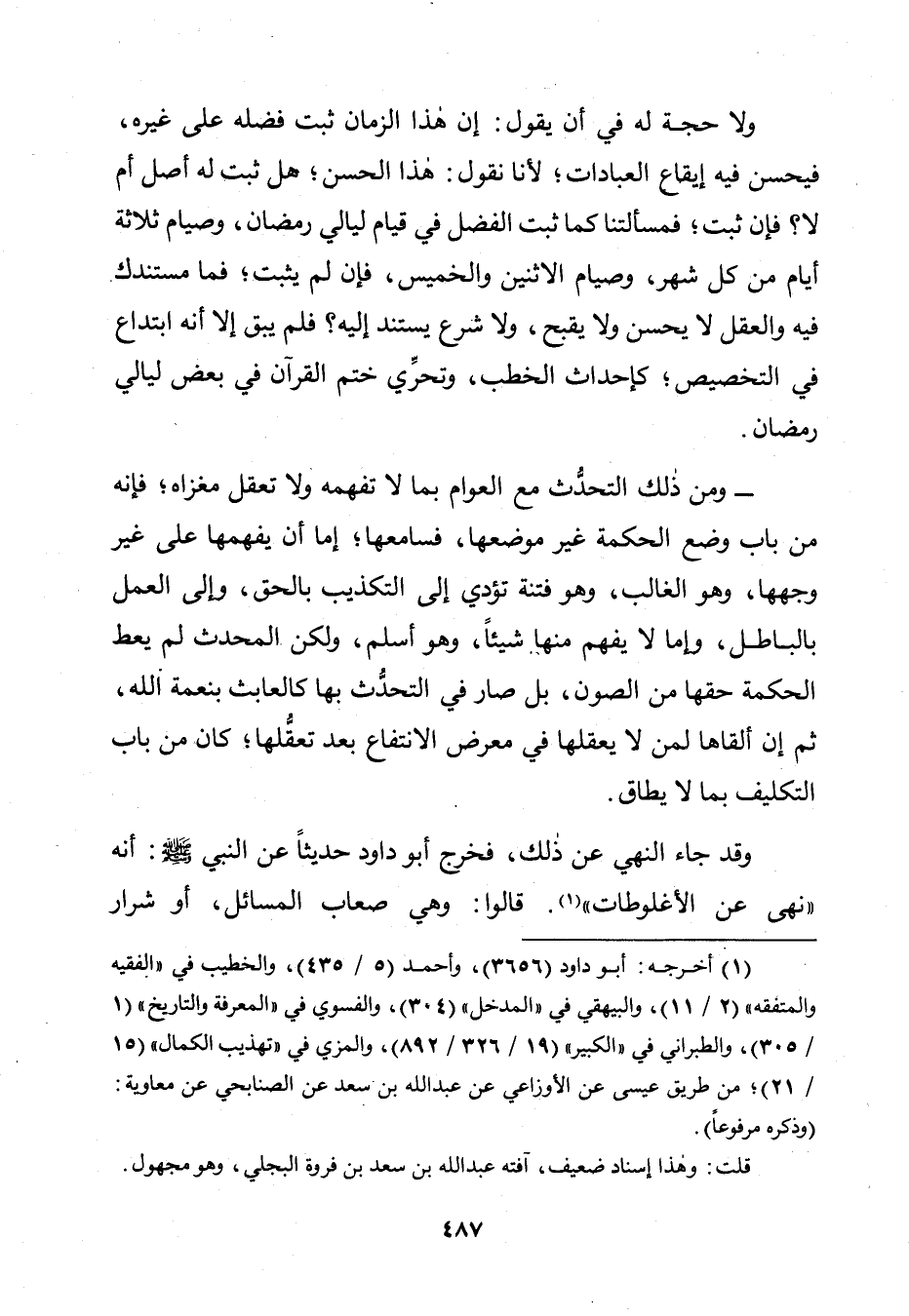 وَقَدْ جَاءَ النَّهْيُ عَنْ ذَلِكَ، فَخَرَّجَ أَبُو دَاوُدَ حَدِيثًا عَنِ النَّبِيِّ صَلَّى اللَّهُ عَلَيْهِ وَسَلَّمَ: «أَنَّهُ نَهَى عَنِ الْأُغْلُوطَاتِ، قَالُوا: وَهِيَ صِعَابُ الْمَسَائِلِ، أَوْ شِرَارُ