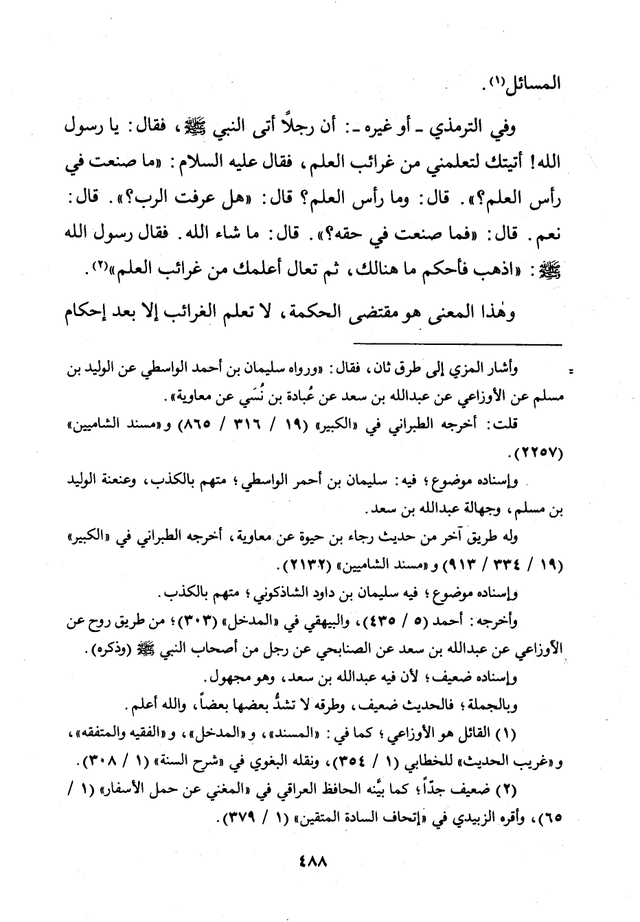 وَفِي التِّرْمِذِيِّ ـ أَوْ غَيْرِهِ ـ: «أَنَّ رَجُلًا أَتَى النَّبِيَّ صَلَّى اللَّهُ عَلَيْهِ وَسَلَّمَ، فَقَالَ: يَا رَسُولَ اللَّهِ! أَتَيْتُكَ لِتُعَلِّمَنِي مِنْ غَرَائِبِ الْعِلْمِ، فَقَالَ عَلَيْهِ السَّلَامُ: " مَا صَنَعْتَ فِي رَأْسِ الْعِلْمِ؟ " قَالَ: وَمَا رَأْسُ الْعِلْمِ؟ قَالَ: " هَلْ عَرَفْتَ الرَّبَّ؟ " قَالَ: نَعَمْ، قَالَ: فَمَا صَنَعْتَ فِي حَقِّهِ؟ قَالَ: مَا شَاءَ اللَّهُ، فَقَالَ رَسُولُ اللَّهِ صَلَّى اللَّهُ عَلَيْهِ وَسَلَّمَ: اذْهَبْ فَأَحْكِمْ مَا هُنَالِكَ، ثُمَّ تَعَالَ أُعَلِّمْكَ مِنْ غَرَائِبِ الْعِلْمِ».