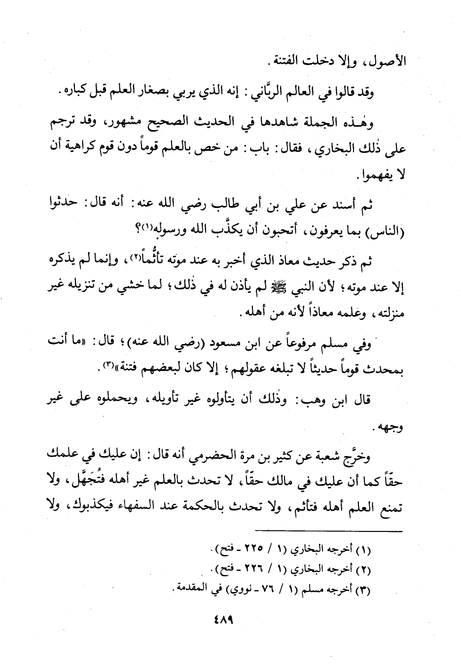 ثُمَّ أَسْنَدَ عَنْ عَلِيِّ بْنِ أَبِي طَالِبٍ رَضِيَ اللَّهُ عَنْهُ: أَنَّهُ قَالَ: حَدِّثُوا (النَّاسَ) بِمَا يَعْرِفُونَ، أَتُحِبُّونَ أَنْ يُكَذَّبَ اللَّهُ وَرَسُولُهُ؟.