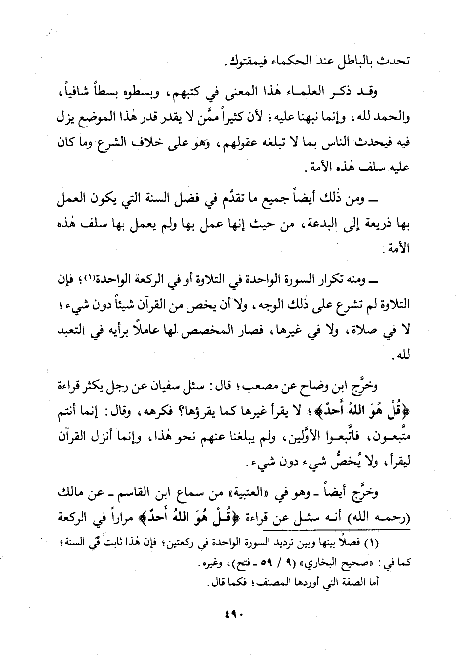 وَخَرَّجَ ابْنُ وَضَّاحٍ عَنْ مُصْعَبٍ، قَالَ: سُئِلَ سُفْيَانُ عَنْ رَجُلٍ يُكْثِرُ قِرَاءَةَ: {قُلْ هُوَ اللَّهُ أَحَدٌ} [الإخلاص: 1]؛ لَا يَقْرَأُ غَيْرَهَا كَمَا يَقْرَؤُهَا؟ فَكَرِهَهُ، وَقَالَ: إِنَّمَا أَنْتُمْ مُتَّبِعُونَ، فَاتَّبِعُوا الْأَوَّلِينَ، وَلَمْ يَبْلُغْنَا عَنْهُمْ نَحْوُ هَذَا، وَإِنَّمَا أُنْزِلَ الْقُرْآنُ لِيُقْرَأَ، وَلَا يُخَصُّ شَيْءٌ دُونَ شَيْءٍ.