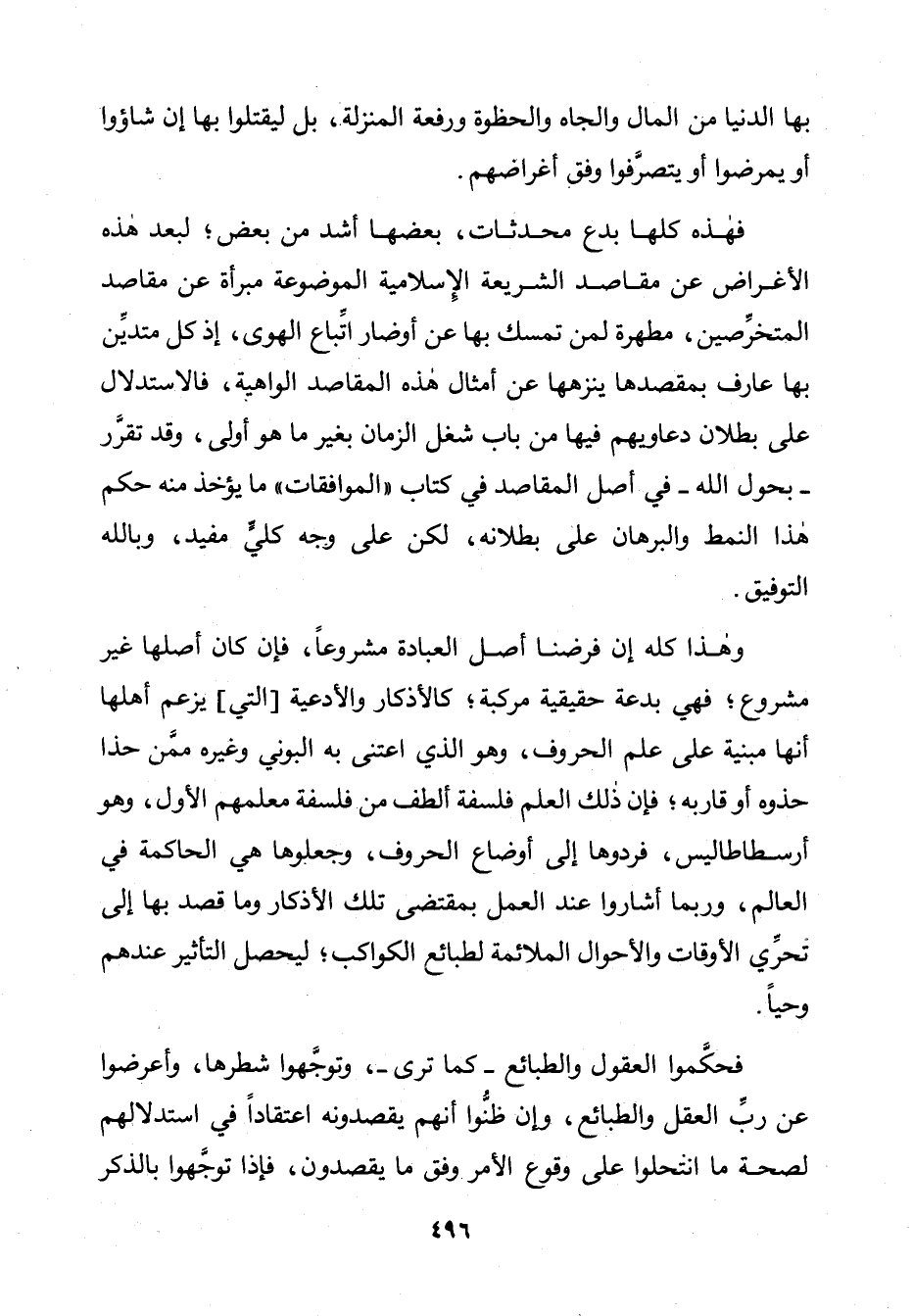 وَهَذَا كُلُّهُ إِنْ فَرَضْنَا أَصْلَ الْعِبَادَةِ مَشْرُوعًا، فَإِنْ كَانَ أَصْلُهَا غَيْرَ مَشْرُوعٍ؛ فَهِيَ بِدْعَةٌ حَقِيقِيَّةٌ مُرَكَّبَةٌ؛ كَالْأَذْكَارِ وَالْأَدْعِيَةِ [الَّتِي] يَزْعُمُ الْعُلَمَاءُ أَنَّهَا مَبْنِيَّةٌ عَلَى عِلْمِ الْحُرُوفِ، وَهُوَ الَّذِي اعْتَنَى بِهِ الْبَوْنِيُّ وَغَيْرُهُ مِمَّنْ حَذَا حَذْوَهُ أَوْ قَارَبَهُ. فَإِنَّ ذَلِكَ الْعِلْمَ فَلْسَفَةٌ أَلْطَفُ مِنْ فَلْسَفَةِ مُعَلِّمِهِمُ الْأَوَّلِ، وَهُوَ أَرِسْطَا طَالِيسَ، فَرَدُّوهَا إِلَى أَوْضَاعِ الْحُرُوفَ، وَجَعَلُوهَا هِيَ الْحَاكِمَةَ فِي الْعَالَمِ، وَرُبَّمَا أَشَارُوا عِنْدَ الْعَمَلِ بِمُقْتَضَى تِلْكَ الْأَذْكَارِ وَمَا قُصِدَ بِهَا إِلَى تَحَرِّي الْأَوْقَاتِ وَالْأَحْوَالِ الْمُلَائِمَةِ لِطَبَائِعِ الْكَوَاكِبِ؛ لِيَحْصُلَ التَّأْثِيرُ عِنْدَهُمْ وَحْيًا.