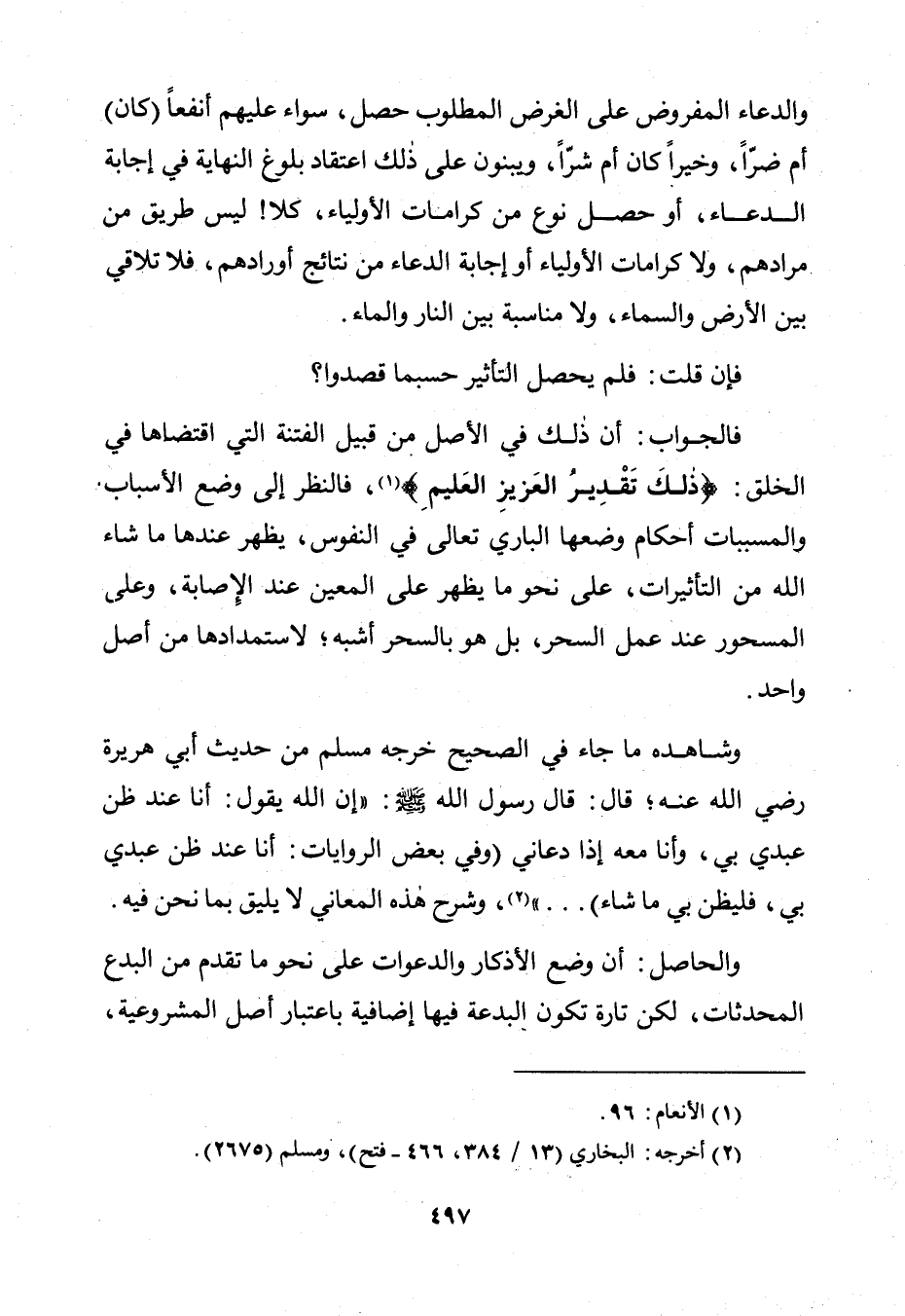 وَالدُّعَاءِ الْمَفْرُوضِ عَلَى الْغَرَضِ الْمَطْلُوبِ حَصَلَ، سَوَاءٌ عَلَيْهِمْ أَنَفْعًا (كَانَ) أَوْ ضُرًّا، وَخَيْرًا كَانَ أَمْ شَرًّا، وَيَبْنُونَ عَلَى ذَلِكَ اعْتِقَادَ بُلُوغِ النِّهَايَةِ فِي إِجَابَةِ الدُّعَاءِ، أَوْ حَصَلَ نَوْعٌ مِنْ كَرَامَاتِ الْأَوْلِيَاءِ، كَلَّا! لَيْسَ طَرِيقُ ذَلِكَ التَّأْثِيرِ مِنْ مُرَادِهِمْ، وَلَا كَرَامَاتِ الْأَوْلِيَاءِ أَوْ إِجَابَةِ الدُّعَاءِ مِنْ نَتَائِجِ أَوْرَادِهِمْ، فَلَا تَلَاقِي بَيْنَ الْأَرْضِ وَالسَّمَاءِ، وَلَا مُنَاسَبَةَ بَيْنَ النَّارِ وَالْمَاءِ.