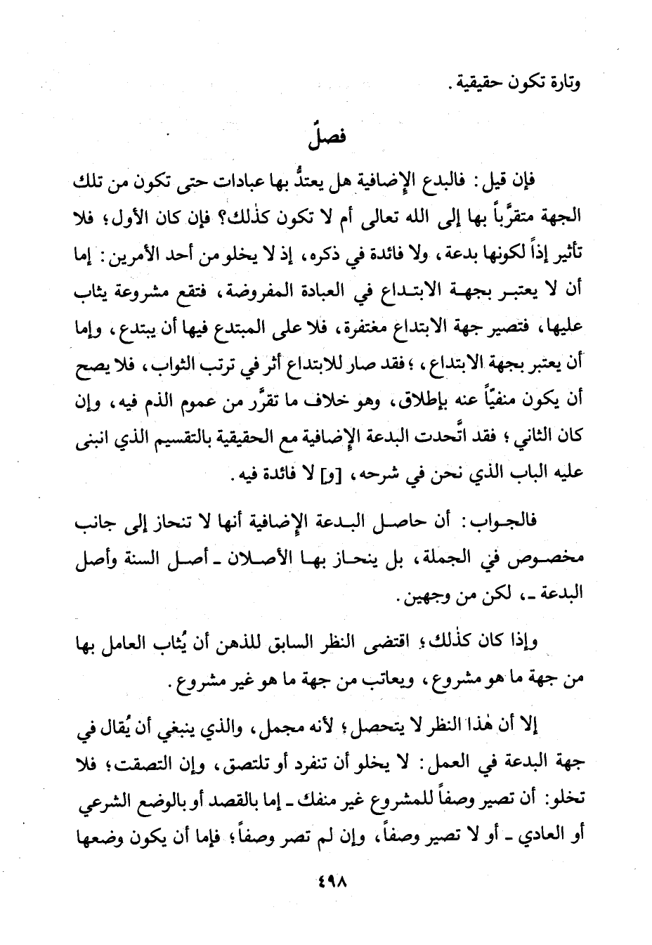 فَإِنْ قِيلَ: فَالْبِدَعُ الْإِضَافِيَّةُ هَلْ يُعْتَدُّ بِهَا عِبَادَاتٍ حَتَّى تَكُونَ مِنْ تِلْكَ الْجِهَةِ مُتَقَرَّبًا بِهَا إِلَى اللَّهِ تَعَالَى أَمْ لَا تَكُونُ كَذَلِكَ؟ فَإِنْ كَانَ الْأَوَّلُ؛ فَلَا تَأْثِيرَ إِذًا لِكَوْنِهَا بِدْعَةً، وَلَا فَائِدَةَ فِي ذِكْرِهِ، إِذْ لَا يَخْلُو مِنْ أَحَدِ الْأَمْرَيْنِ: إِمَّا أَنْ لَا يُعْتَبَرَ بِجِهَةِ الِابْتِدَاعِ فِي الْعِبَادَةِ الْمَفْرُوضَةِ، فَتَقَعُ مَشْرُوعَةً يُثَابُ عَلَيْهَا، فَتَصِيرُ جِهَةَ الِابْتِدَاعِ مُغْتَفِرَةً، فَلَا عَلَى الْمُبْتَدَعِ فِيهَا أَنْ يَبْتَدِعَ، وَإِمَّا أَنْ يُعْتَبَرَ بِجِهَةِ الِابْتِدَاعِ؛ فَقَدْ صَارَ لِلِابْتِدَاعِ أَثَرٌ فِي تَرَتُّبِ الثَّوَابِ، فَلَا يَصِحُّ أَنْ يَكُونَ مَنْفِيًّا عَنْهُ بِإِطْلَاقٍ، وَهُوَ خِلَافُ مَا تَقَرَّرَ مِنْ عُمُومِ الذَّمِّ فِيهِ، وَإِنْ كَانَ الثَّانِي؛ فَقَدِ اتَّحَدَتِ الْبِدْعَةُ الْإِضَافِيَّةُ مَعَ الْحَقِيقِيَّةِ بِالتَّقْسِيمِ الَّذِي انْبَنَى عَلَيْهِ الْبَابُ الَّذِي نَحْنُ فِي شَرْحِهِ، [وَ] وَلَا فَائِدَةَ فِيهِ.