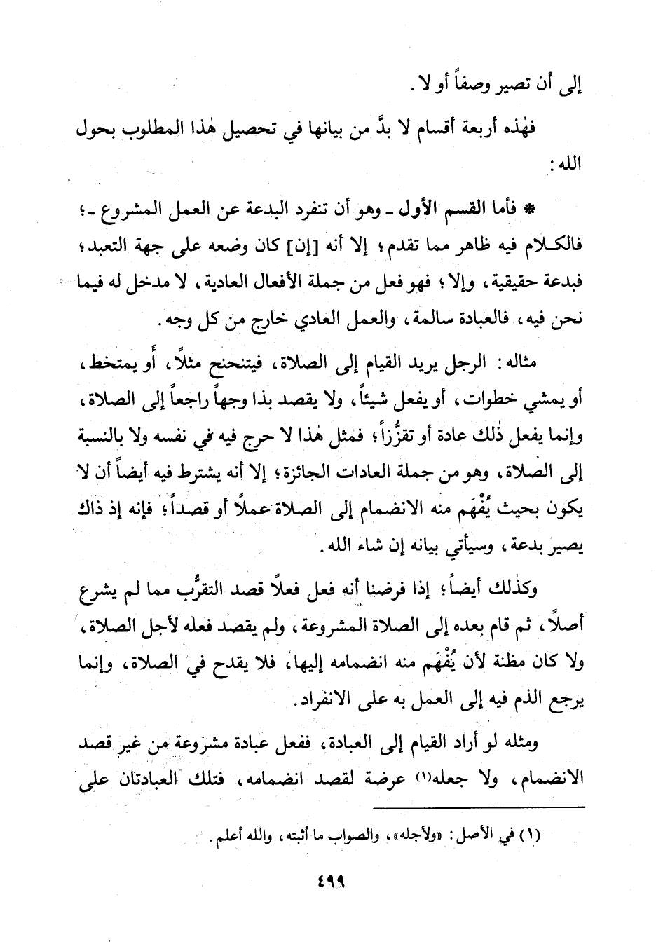 فَأَمَّا الْقِسْمُ الْأَوَّلُ: وَهُوَ أَنْ تَنْفَرِدَ الْبِدْعَةُ عَنِ الْعَمَلِ الْمَشْرُوعِ ـ؛ فَالْكَلَامُ فِيهِ ظَاهِرُ مِمَّا تَقَدَّمَ؛ إِلَّا أَنَّهُ [إِنْ] كَانَ وَضْعُهُ عَلَى جِهَةِ التَّعَبُّدِ؛ فَبِدْعَةٌ حَقِيقِيَّةٌ، وَإِلَّا فَهُوَ فِعْلٌ مِنْ جُمْلَةِ الْأَفْعَالِ الْعَادِيَّةِ، لَا مَدْخَلَ لَهُ فِيمَا نَحْنُ فِيهِ، فَالْعِبَادَةُ سَالِمَةٌ، وَالْعَمَلُ الْعَادِيُّ خَارِجٌ مِنْ كُلِّ وَجْهٍ.