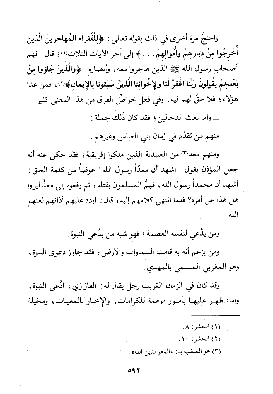 وَمَنْ يَدَّعِي لِنَفْسِهِ الْعِصْمَةَ، فَهُوَ شِبْهُ مَنْ يَدَّعِي النُّبُوَّةَ، وَمَنْ يَزْعُمُ أَنَّهُ بِهِ قَامَتِ السَّمَوَاتُ وَالْأَرْضُ، فَقَدْ جَاوَزَ دَعْوَى النُّبُوَّةِ، وَهُوَ الْمَغْرِبِيُّ الْمُتَسَمَّى بِالْمَهْدِيِّ.