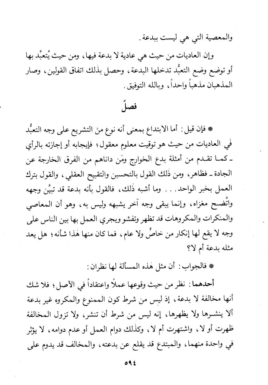 فَإِنْ قِيلَ: أَمَّا الِابْتِدَاعُ، بِمَعْنَى أَنَّهُ نَوْعٌ مِنَ التَّشْرِيعِ عَلَى وَجْهِ التَّعَبُّدِ فِي الْعَادِيَاتِ مِنْ حَيْثُ هُوَ تَوْقِيتٌ مَعْلُومٌ مَعْقُولٌ، فَإِيجَابُهُ أَوْ إِجَازَتُهُ بِالرَّأْيِ ـ كَمَا تَقَدَّمَ مِنْ أَمْثِلَةِ بِدَعِ الْخَوَارِجِ وَمَنْ دَانَاهُمْ مِنَ الْفِرَقِ الْخَارِجِيَّةِ عَنِ الْجَادَّةِ ـ فَظَاهَرَ.