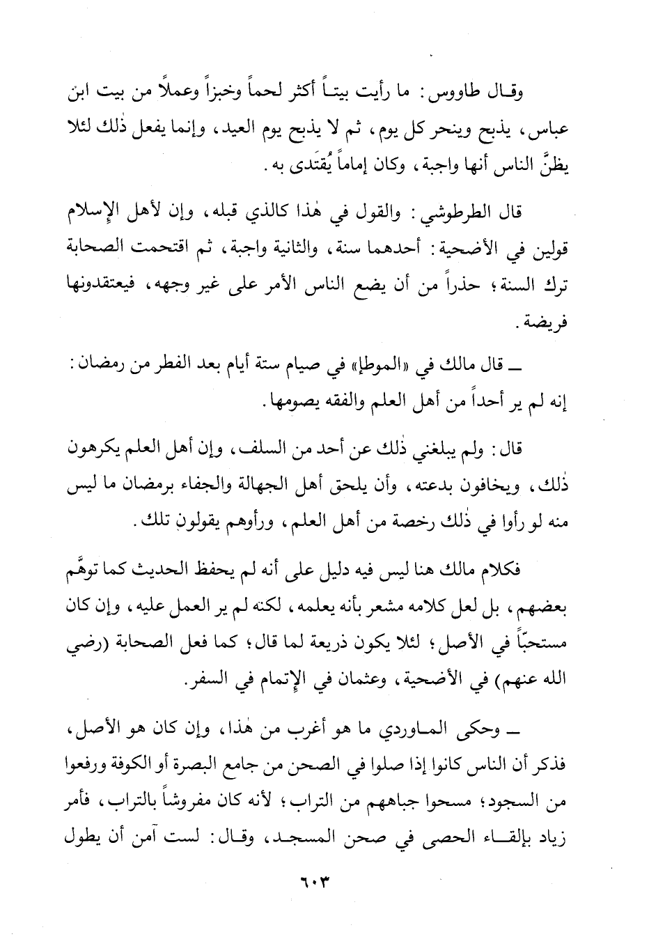 قَالَ الطَّرْطُوشِيُّ: وَالْقَوْلُ فِي هَذَا كَالَّذِي قَبْلَهُ، وَإِنَّ لِأَهْلِ الْإِسْلَامِ قَوْلَيْنِ فِي الْأُضْحِيَّةِ. أَحَدُهُمَا سُنَّةٌ، وَالثَّانِي وَاجِبَةٌ، ثُمَّ اقْتَحَمَتِ الصَّحَابَةُ تَرْكَ السُّنَّةِ حَذَرًا مِنْ أَنْ يَضَعَ النَّاسُ الْأَمْرَ عَلَى غَيْرِ وَجْهِهِ فَيَعْتَقِدُونَهَا فَرِيضَةً.