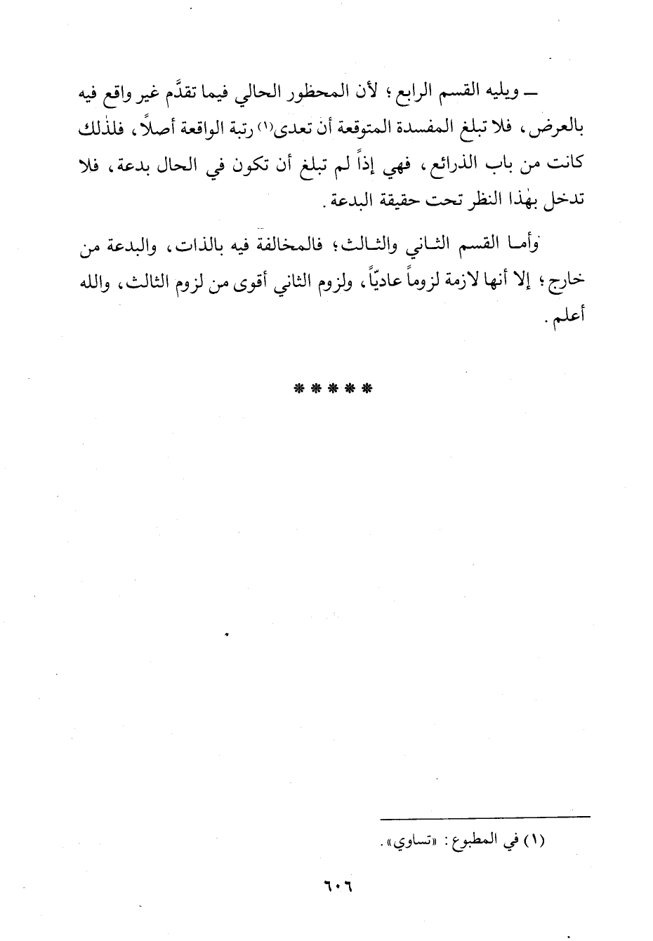 وَيَلِيهِ الْقِسْمُ الرَّابِعُ، لِأَنَّ الْمَحْظُورَ الْحَالِيَّ فِيمَا تَقَدَّمَ غَيْرُ وَاقِعٍ فِيهِ بِالْعَرْضِ، فَلَا تَبْلُغُ الْمَفْسَدَةُ الْمُتَوَقَّعَةُ أَنْ تَعَدَّى رُتْبَةَ الْوَاقِعَةِ أَصْلًا، فَلِذَلِكَ كَانَتْ مِنْ بَابِ الذَّرَائِعِ، فَهِيَ إِذًا لَمْ تَبْلُغْ أَنْ تَكُونَ فِي الْحَالِ بِدْعَةً، فَلَا تَدْخُلُ بِهَذَا النَّظَرِ تَحْتَ حَقِيقَةِ الْبِدْعَةِ.