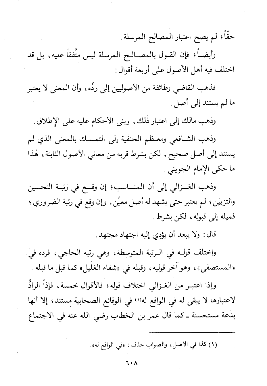 وَأَيْضًا؛ فَإِنَّ الْقَوْلَ بِالْمَصَالِحِ الْمُرْسَلَةِ لَيْسَ مُتَّفَقًا عَلَيْهِ، بَلْ قَدِ اخْتَلَفَ فِيهِ أَهْلُ الْأُصُولِ عَلَى أَرْبَعَةِ أَقْوَالٍ. فَذَهَبَ الْقَاضِي وَطَائِفَةٌ مِنَ الْأُصُولِيِّينَ إِلَى رَدِّهِ، وَأَنَّ الْمَعْنَى لَا يُعْتَبَرُ مَا لَمْ يَسْتَنِدْ إِلَى أَصْلٍ. وَذَهَبَ مَالِكٌ إِلَى اعْتِبَارِ ذَلِكَ، وَبَنَى الْأَحْكَامَ عَلَيْهِ عَلَى الْإِطْلَاقِ، وَذَهَبَ الشَّافِعِيُّ وَمُعْظَمُ الْحَنَفِيَّةِ إِلَى التَّمَسُّكِ بِالْمَعْنَى الَّذِي لَمْ يَسْتَنِدْ إِلَى أَصْلٍ صَحِيحٍ، لَكِنْ بِشَرْطِ قُرْبِهِ مِنْ مَعَانِي الْأُصُولِ الثَّابِتَةِ هَذَا مَا حَكَى الْإِمَامُ الْجُوَيْنِيُّ.