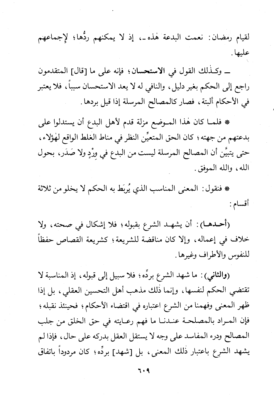 فَلَمَّا كَانَ هَذَا الْمَوْضِعُ مَزَلَّةَ قَدَمٍ، لِأَهْلِ الْبِدَعِ أَنْ يَسْتَدِلُّوا عَلَى بِدْعَتِهِمْ مِنْ جِهَتِهِ؛ كَانَ الْحَقُّ الْمُتَعَيَّنُ النَّظَرَ فِي مَنَاطِ الْغَلَطِ الْوَاقِعِ لِهَؤُلَاءِ، حَتَّى يَتَبَيَّنَ أَنَّ الْمَصَالِحَ الْمُرْسَلَةَ لَيْسَتْ مِنَ الْبِدَعِ فِي وِرْدٍ وَلَا صَدْرٍ، بِحَوْلِ اللَّهِ، وَاللَّهُ الْمُوَفِّقُ.