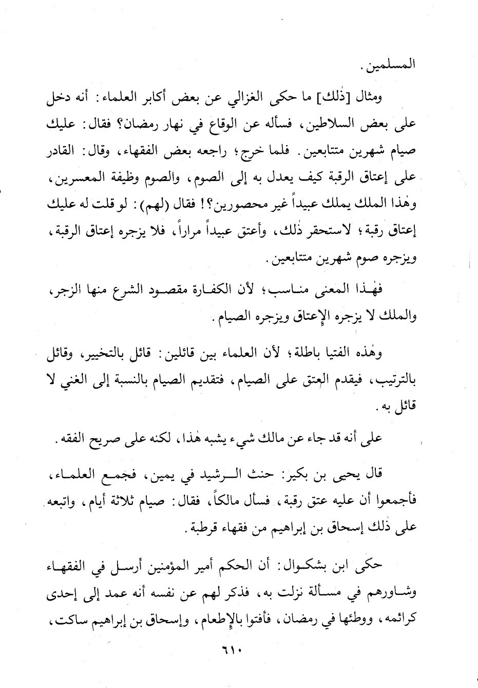 وَمِثَالُ [ذَلِكَ] مَا حَكَى الْغَزَالِيُّ عَنْ بَعْضِ أَكَابِرِ الْعُلَمَاءِ أَنَّهُ دَخَلَ عَلَى بَعْضِ السَّلَاطِينِ فَسَأَلَهُ عَنِ الْوِقَاعِ فِي نَهَارِ رَمَضَانَ، فَقَالَ: عَلَيْكَ صِيَامُ شَهْرَيْنِ مُتَتَابِعَيْنِ. فَلَمَّا خَرَجَ رَاجَعَهُ بَعْضُ الْفُقَهَاءِ وَقَالُوا لَهُ: الْقَادِرُ عَلَى إِعْتَاقِ الرَّقَبَةِ كَيْفَ يُعْدَلُ بِهِ إِلَى الصَّوْمِ وَالصَّوْمُ وَظِيفَةُ الْمُعْسِرِينَ، وَهَذَا الْمَلِكُ يَمْلِكُ عَبِيدًا غَيْرَ مَحْصُورِينَ؟ فَقَالَ لَهُمْ: لَوْ قُلْتُ لَهُ عَلَيْكَ إِعْتَاقُ رَقَبَةٍ لَاسْتَحْقَرَ ذَلِكَ وَأَعْتَقَ عَبِيدًا مِرَارًا، فَلَا يَزْجُرُهُ إِعْتَاقُ الرَّقَبَةِ وَيَزْجُرُهُ صَوْمُ شَهْرَيْنِ مُتَتَابِعَيْنِ.