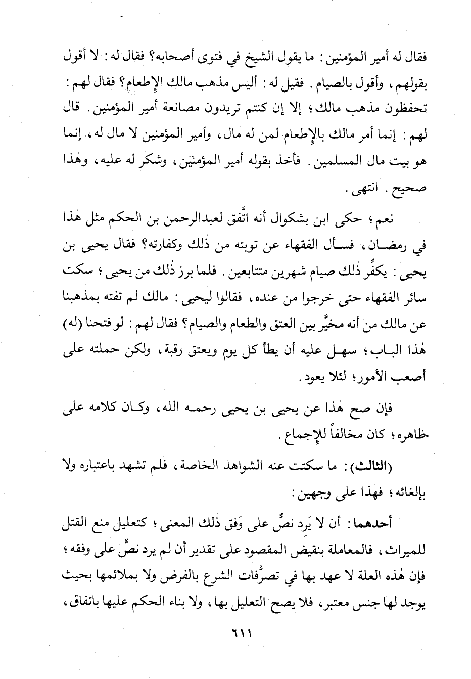 فَقَالَ لَهُ أَمِيرُ الْمُؤْمِنِينَ: مَا يَقُولُ الشَّيْخُ فِي فَتْوَى أَصْحَابِهِ؟ فَقَالَ لَهُ: لَا أَقُولُ بِقَوْلِهِمْ، وَأَقُولُ بِالصِّيَامِ. فَقِيلَ لَهُ: أَلَيْسَ مَذْهَبُ مَالِكٍ الْإِطْعَامُ؟ فَقَالَ لَهُمْ: تَحْفَظُونَ مَذْهَبَ مَالِكٍ، إِلَا إِنْ كُنْتُمْ تُرِيدُونَ مُصَانَعَةَ أَمِيرِ الْمُؤْمِنِينَ. إِنَّمَا أَمَرَ بِالْإِطْعَامِ لِمَنْ لَهُ مَالٌ، وَأَمِيرُ الْمُؤْمِنِينَ لَا مَالَ لَهُ، إِنَّمَا هُوَ بَيْتُ مَالِ الْمُسْلِمِينَ، فَأَخَذَ بِقَوْلِهِ أَمِيرُ الْمُؤْمِنِينَ وَشَكَرَ لَهُ عَلَيْهِ اهـ. وَهَذَا صَحِيحٌ.