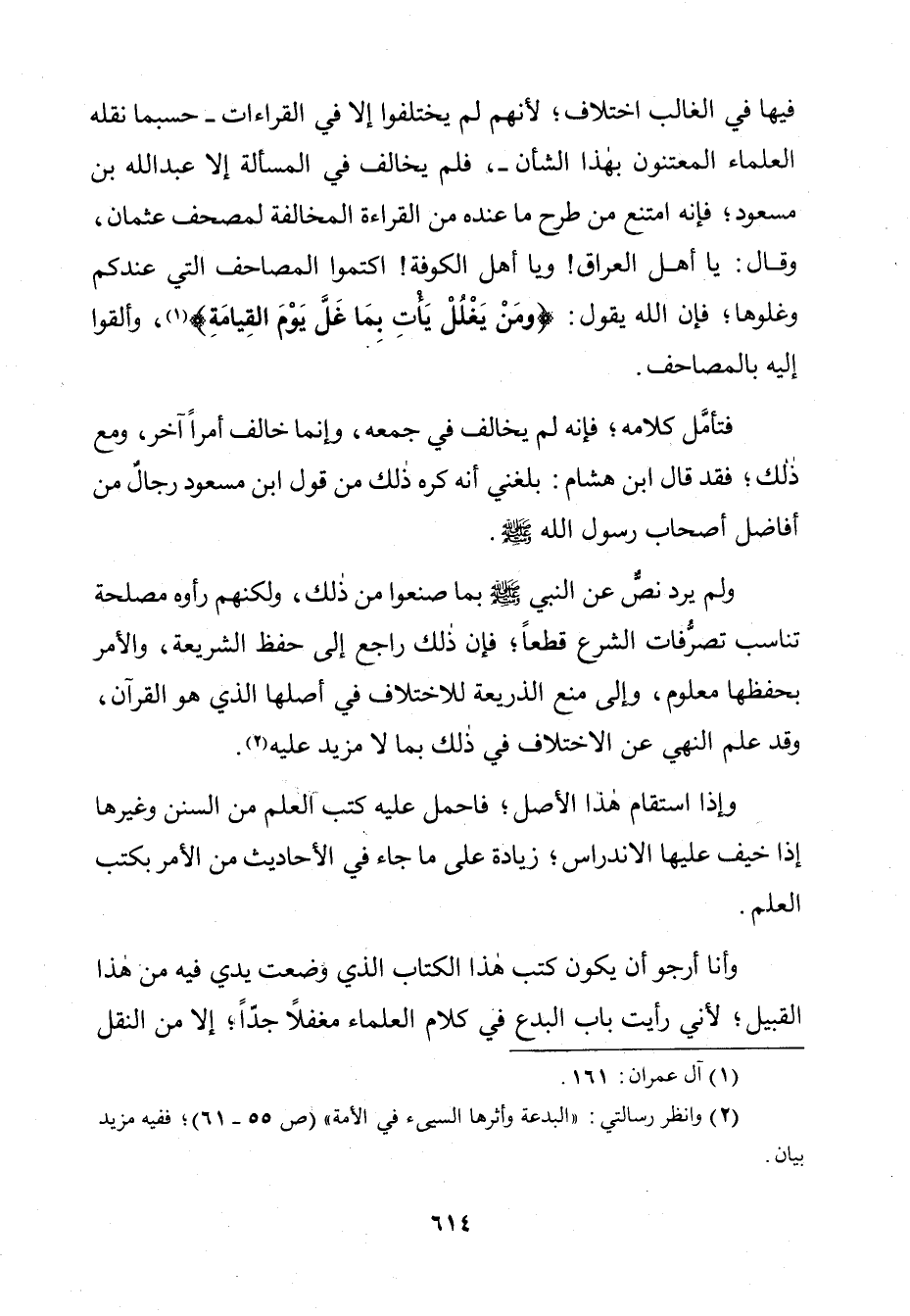 فِيهَا فِي الْغَالِبِ اخْتِلَافٌ. لِأَنَّهُمْ لَمْ يَخْتَلِفُوا إِلَّا فِي الْقِرَاءَاتِ ـ حَسْبَمَا نَقَلَهُ الْعُلَمَاءُ الْمُعْتَنُونَ بِهَذَا الشَّأْنِ ـ فَلَمْ يُخَالِفْ فِي الْمَسْأَلَةِ إِلَّا عَبْدُ اللَّهِ بْنُ مَسْعُودٍ فَإِنَّهُ امْتَنَعَ مِنْ طَرْحِ مَا عِنْدَهُ مِنَ الْقِرَاءَةِ الْمُخَالِفَةِ لِمَصَاحِفِ عُثْمَانَ، وَقَالَ: يَا أَهْلَ الْعِرَاقِ! وَيَا أَهْلَ الْكُوفَةِ: اكْتُمُوا الْمَصَاحِفَ الَّتِي عِنْدَكُمْ وَغُلُّوهَا، فَإِنَّ اللَّهَ يَقُولُ: {وَمَنْ يَغْلُلْ يَأْتِ بِمَا غَلَّ يَوْمَ الْقِيَامَةِ} [آل عمران: 161] وَأَلْقَوْا إِلَيْهِ بِالْمَصَاحِفِ.