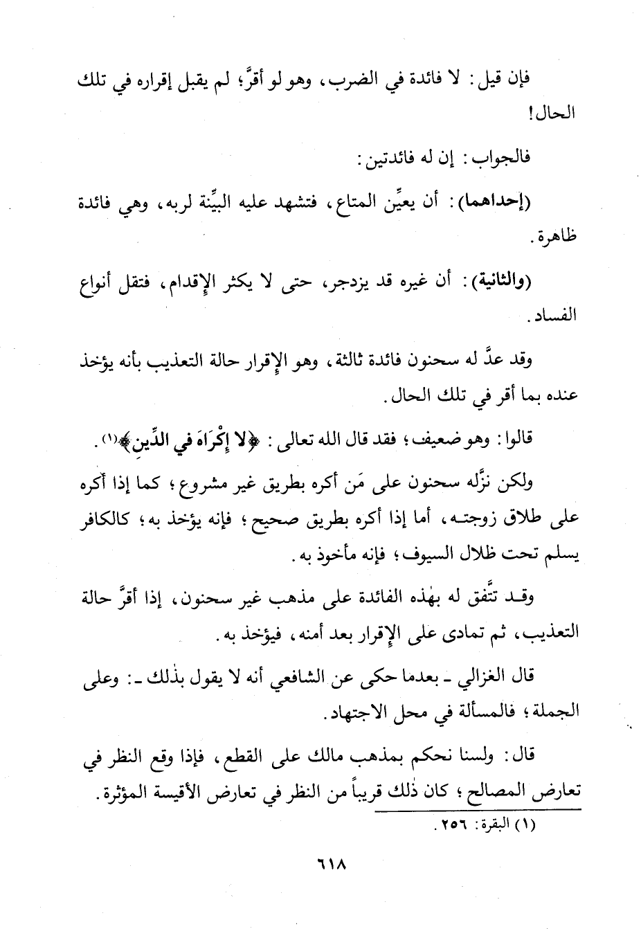 قَالُوا: وَهُوَ ضَعِيفٌ. فَقَدْ قَالَ اللَّهُ تَعَالَى: {لَا إِكْرَاهَ فِي الدِّينِ} [البقرة: 256] وَلَكِنْ نَزَّلَهُ سَحْنُونُ عَلَى مَنْ أُكْرِهَ بِطَرِيقٍ غَيْرِ مَشْرُوعٍ كَمَا إِذَا أُكْرِهَ عَلَى طَلَاقِ زَوْجَتِهِ، أَمَّا إِذَا أُكْرِهَ بِطْرِيقٍ صَحِيحٍ فَإِنَّهُ يُؤْخَذُ بِهِ. فَالْكَافِرُ يُسْلِمُ تَحْتَ ظِلَالِ السُّيُوفِ فَإِنَّهُ مَأْخُوذٌ بِهِ، وَقَدْ تَتَّفِقُ لَهُ بِهَذِهِ الْفَائِدَةِ عَلَى مَذْهَبِ غَيْرِ سَحْنُونَ إِذَا أَقَرَّ حَالَةَ التَّعْذِيبِ ثُمَّ تَمَادَى عَلَى الْإِقْرَارِ بَعْدَ أَمْنِهِ فَيُؤْخَذُ بِهِ.