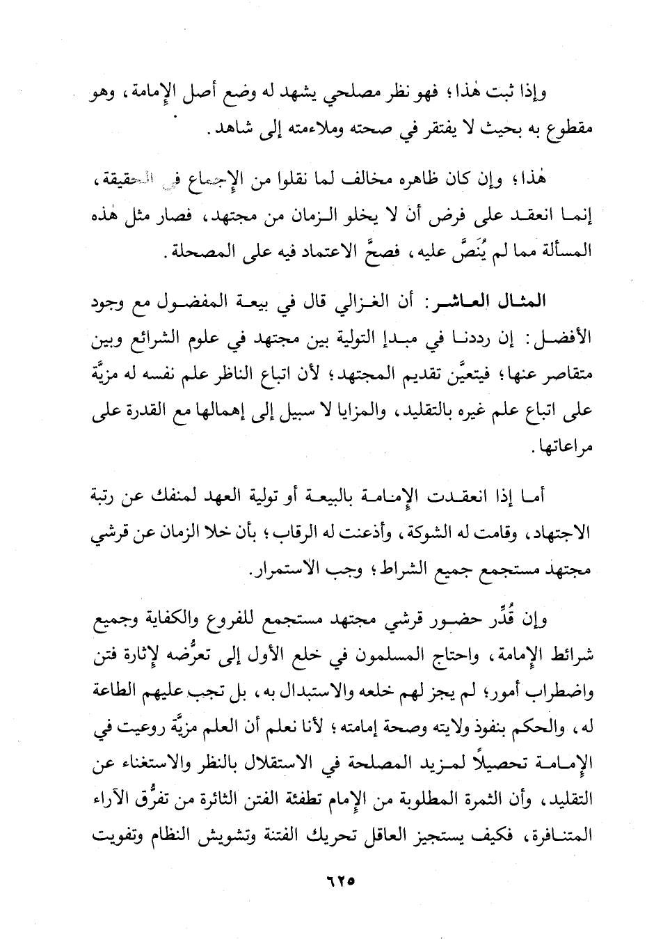 وَإِنْ قُدِّرَ حُضُورُ قُرَشِيٍّ مُجْتَهِدٍ مُسْتَجْمِعٍ لِلْفُرُوعِ وَالْكِفَايَةِ، وَجَمِيعِ شَرَائِطِ الْإِمَامَةِ وَاحْتَاجَ الْمُسْلِمُونَ فِي خَلْعِ الْأَوَّلِ إِلَى تَعَرُّضِهِ لِإِثَارَةِ فِتَنٍ وَاضْطِرَابِ أُمُورٍ، لَمْ يَجُزْ لَهُمْ خَلْعُهُ وَالِاسْتِبْدَالُ بِهِ، بَلْ تَجِبُ عَلَيْهِمُ الطَّاعَةُ لَهُ، وَالْحُكْمُ بِنُفُوذِ وِلَايَتِهِ، وَصِحَّةِ إِمَامَتِهِ، لِأَنَّا نَعْلَمُ أَنَّ الْعِلْمَ مَزِيَّةٌ رُوعِيَتْ فِي الْإِمَامَةِ تَحْصِيلًا لِمَزِيدِ الْمَصْلَحَةِ فِي الِاسْتِقْلَالِ بِالنَّظَرِ وَالِاسْتِغْنَاءِ عَنِ التَّقْلِيدِ، وَأَنَّ الثَّمَرَةَ الْمَطْلُوبَةَ مِنَ الْإِمَامِ تُطْفِئُةُ الْفِتَنُ الثَّائِرَةُ مِنْ تَفَرُّقِ الْآرَاءِ الْمُتَنَافِرَةِ، فَكَيْفَ يَسْتَجِيزُ الْعَاقِلُ تَحْرِيكَ الْفِتْنَةِ، وَتَشْوِيشَ النِّظَامِ، وَتَفْوِيتَ
