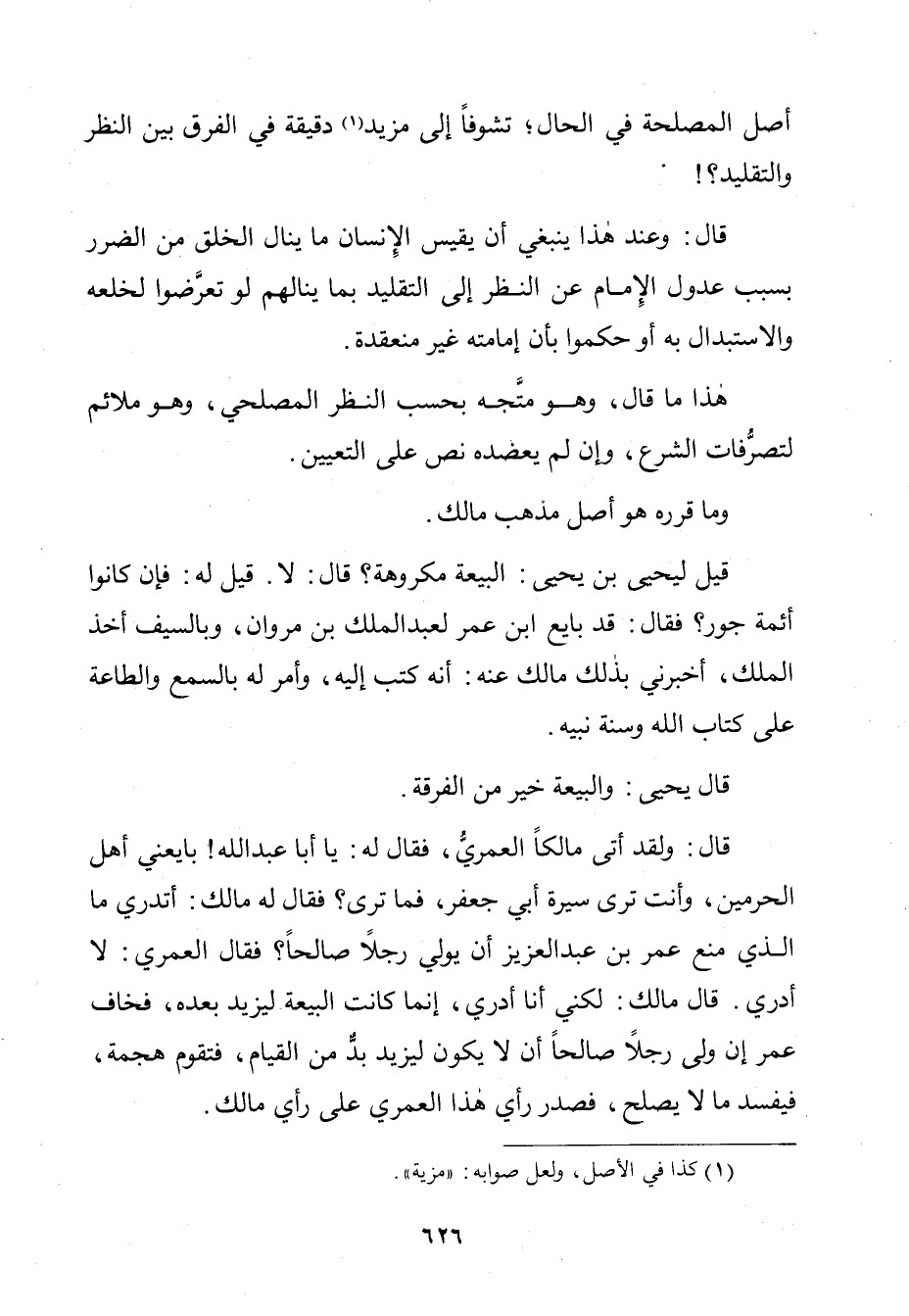 قَالَ: وَلَقَدْ أَتَى مَالِكًا الْعُمَرِيَّ فَقَالَ لَهُ: يَا أَبَا عَبْدِ اللَّهِ، بَايَعَنِي أَهْلُ الْحَرَمَيْنِ، وَأَنْتَ تَرَى سِيرَةَ أَبِي جَعْفَرٍ، فَمَا تَرَى؟ فَقَالَ لَهُ مَالِكٌ: أَتَدْرِي مَا الَّذِي مَنَعَ عُمَرَ بْنَ عَبْدِ الْعَزِيزِ أَنْ يُوَلِّيَ رَجُلًا صَالِحًا؟ فَقَالَ الْعُمَرِيُّ: لَا أَدْرِي، قَالَ مَالِكٌ لَكِنِّي أَنَا أَدْرِي، إِنَّمَا كَانَتِ الْبَيْعَةُ لِيَزِيدَ بَعْدَهُ، فَخَافَ عُمَرُ إِنْ وَلَّى رَجُلًا صَالِحًا أَنْ لَا يَكُونَ لِيَزِيدَ بُدٌّ مِنَ الْقِيَامِ، فَتَقُومُ هَجْمَةٌ فَيَفْسَدُ مَا لَا يُصْلَحُ، فَصَدَرَ رَأْيُ هَذَا الْعُمَرِيِّ عَلَى رَأْيِ مَالِكٍ.