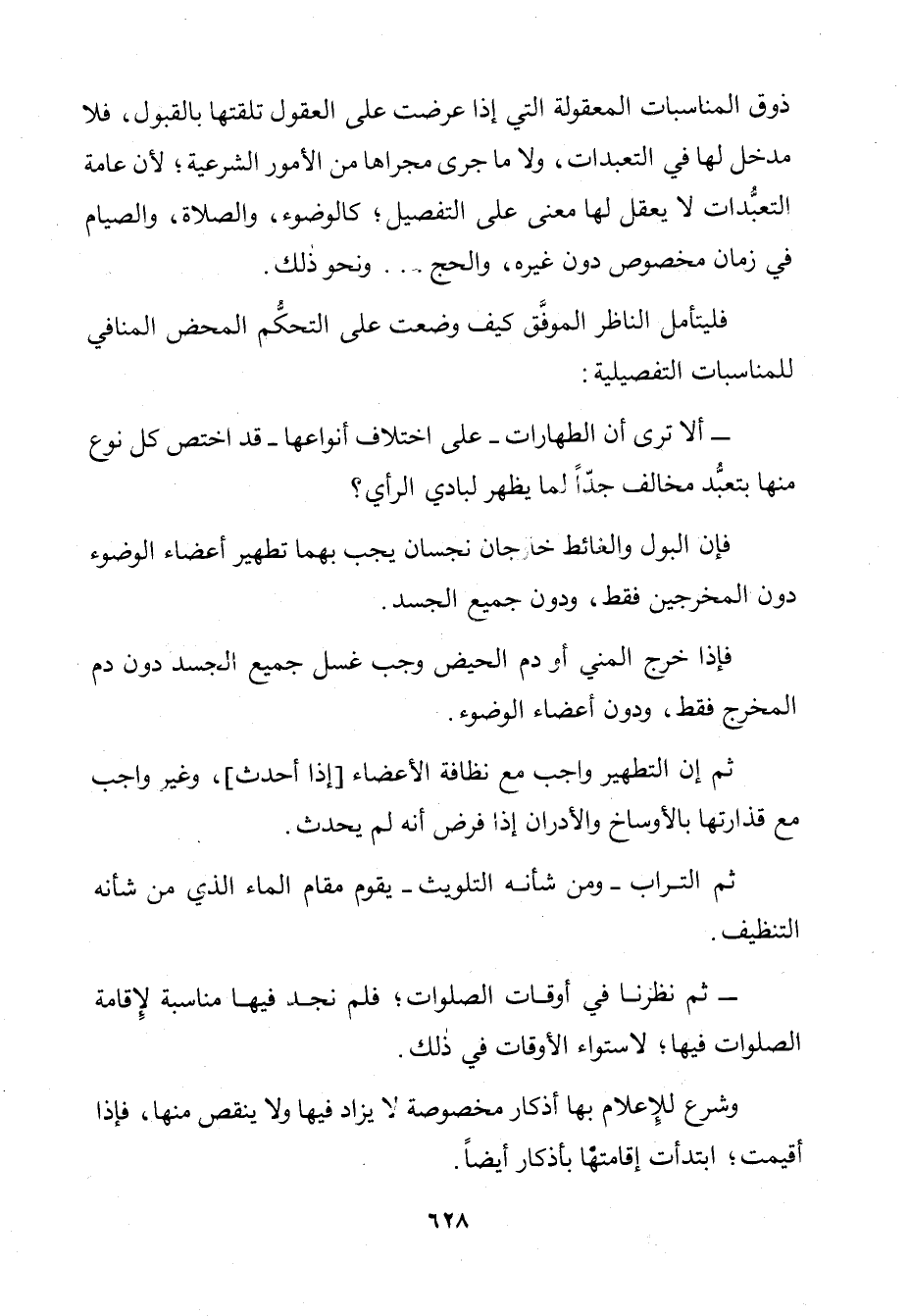 أَلَا تَرَى أَنَّ الطَّهَارَاتِ ـ عَلَى اخْتِلَافِ أَنْوَاعِهَا ـ قَدِ اخْتَصَّ كُلُّ نَوْعٍ مِنْهَا بِتَعَبُّدٍ مُخَالِفٍ جِدًا لِمَا يَظْهَرُ لِبَادِي الرَّأْيِ؟