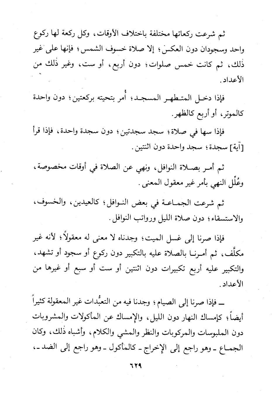 فَإِذَا صِرْنَا إِلَى غُسْلِ الْمَيِّتِ وَجَدْنَاهُ لَا مَعْنَى لَهُ مَعْقُولًا، فَإِنَّهُ غَيْرُ مُكَلَّفٍ، ثُمَّ أُمِرْنَا بِالصَّلَاةِ عَلَيْهِ بِالتَّكْبِيرِ دُونَ رُكُوعٍ أَوْ سُجُودٍ أَوْ تَشَهُّدٍ، وَالتَّكْبِيرُ أَرْبَعُ تَكْبِيرَاتٍ دُونَ اثْنَتَيْنِ أَوْ سِتٍّ أَوْ سَبْعٍ أَوْ غَيْرِهَا مِنَ الْأَعْدَادِ.