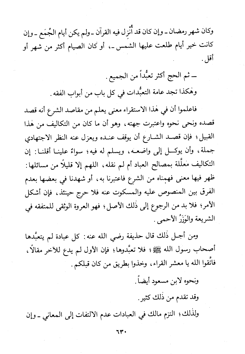 وَهَكَذَا تَجِدُ عَامَّةَ التَّعَبُّدَاتِ فِي كُلِّ بَابٍ مِنْ أَبْوَابِ الْفِقْهِ. فَاعْلَمُوا أَنَّ فِي هَذَا الِاسْتِقْرَاءِ مَعْنًى يُعْلَمُ مِنْ مَقَاصِدِ الشَّرْعِ أَنَّهُ قَصَدَ قَصْدَهُ وَنَحَا نَحْوَهُ وَاعْتُبِرَتْ جِهَتُهُ، وَهُوَ أَنَّ مَا كَانَ مِنَ التَّكَالِيفِ مِنْ هَذَا الْقَبِيلِ فَإِنَّ قَصْدَ الشَّارِعِ أَنْ يُوقِفَ عِنْدَهُ وَيَعْزِلَ عَنْهُ النَّظَرَ الِاجْتِهَادِيَّ جُمْلَةً، وَأَنْ يُوكَلَ إِلَى وَاضِعِهِ وَيُسَلَّمَ لَهُ فِيهِ، وَسَوَاءٌ عَلَيْنَا أَقُلْنَا: إِنَّ التَّكَالِيفَ مُعَلَّلَةٌ بِمَصَالِحِ الْعِبَادِ، أَمْ لَمْ نَقُلْهُ: اللَّهُمَّ إِلَّا قَلِيلًا مِنْ مَسَائِلِهَا ظَهَرَ فِيهَا مَعْنًى فَهِمْنَاهُ مِنَ الشَّرْعِ فَاعْتَبَرْنَا بِهِ أَوْ شَهِدْنَا فِي بَعْضِهَا بِعَدَمِ الْفَرْقِ بَيْنَ الْمَنْصُوصِ عَلَيْهِ، وَالْمَسْكُوتِ عَنْهُ، فَلَا حَرَجَ حِينَئِذٍ فَإِنْ أَشْكَلَ الْأَمْرُ، فَلَا بُدَّ مِنَ الرُّجُوعِ إِلَى ذَلِكَ الْأَصْلِ، فَهُوَ الْعُرْوَةُ الْوُثْقَى لِلْمُتَفَقِّهِ فِي الشَّرِيعَةِ وَالْوِزْرِ الْأَحْمَى.