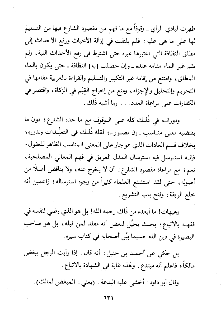 وَدَوَرَانِهِ فِي ذَلِكَ كُلِّهِ عَلَى الْوُقُوفِ مَعَ مَا حَدَّهُ الشَّارِعُ دُونَ مَا يَقْتَضِيهِ مَعْنًى مُنَاسِبٌ ـ إِنْ تَصَوَّرَ ـ لِقِلَّةِ ذَلِكَ فِي التَّعَبُّدَاتِ وَنُدُورِهِ، بِخِلَافِ قِسْمِ الْعَادَاتِ الَّذِي هُوَ جَارٍ عَلَى الْمَعْنَى الْمُنَاسِبِ الظَّاهِرِ لِلْعُقُولِ، فَإِنَّهُ اسْتَرْسَلَ فِيهِ اسْتِرْسَالَ الْمُدِلِّ الْعَرِيقِ فِي فَهْمِ الْمَعَانِي الْمَصْلَحِيَّةِ، نَعَمْ مَعَ مُرَاعَاةِ مَقْصُودِ الشَّارِعِ أَنْ لَا يَخْرُجَ عَنْهُ وَلَا يُنَاقِضَ أَصْلًا مِنْ أُصُولِهِ، حَتَّى لَقَدِ اسْتَشْنَعَ الْعُلَمَاءُ كَثِيرًا مِنْ وُجُوهِ اسْتِرْسَالِهِ زَاعِمِينَ أَنَّهُ خَلَعَ الرِّبْقَةَ، وَفَتَحَ بَابَ التَّشْرِيعِ، وَهَيْهَاتَ مَا أَبْعَدَهُ مِنْ ذَلِكَ! رَحِمَهُ اللَّهُ، بَلْ هُوَ الَّذِي رَضِيَ لِنَفْسِهِ فِي فِقْهِهِ بِالِاتِّبَاعِ، بِحَيْثُ يُخَيَّلُ لِبَعْضٍ أَنَّهُ مُقَلِّدٌ لِمَنْ قَبْلُهُ، بَلْ هُوَ صَاحِبُ الْبَصِيرَةِ فِي دِينِ اللَّهِ ـ حَسْبَمَا بَيَّنَ أَصْحَابُهُ فِي كِتَابِ سِيَرِهِ ـ.
