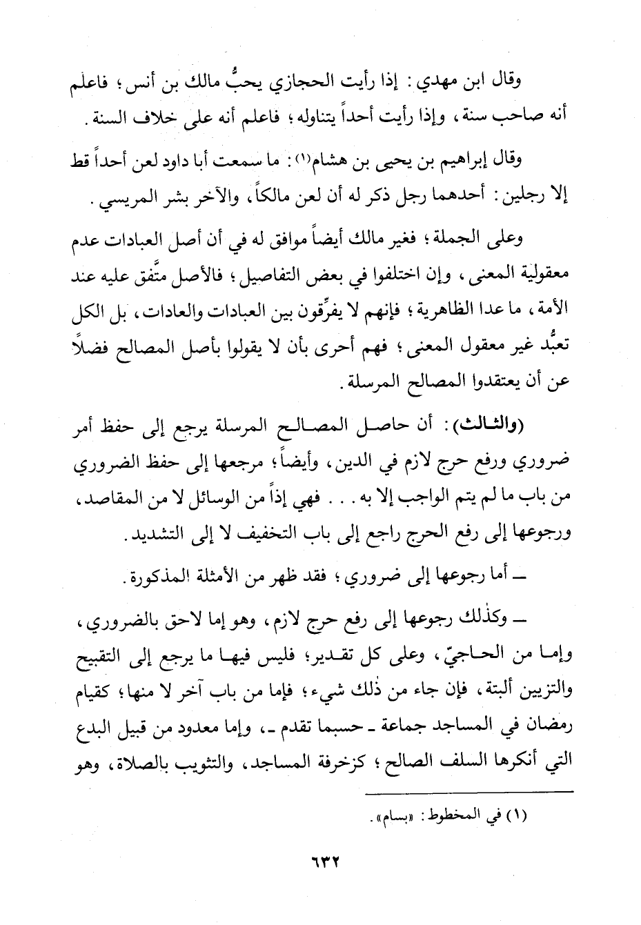 وَالثَّالِثُ: أَنَّ حَاصِلَ الْمَصَالِحِ الْمُرْسَلَةِ يَرْجِعُ إِلَى حِفْظِ أَمْرٍ ضَرُورِيٍّ، وَرَفْعِ حَرَجٍ لَازِمٍ فِي الدِّينِ، وَأَيْضًا مَرْجِعُهَا إِلَى حِفْظِ الضَّرُورِيِّ مِنْ بَابِ مَا لَا يَتِمُّ الْوَاجِبُ إِلَّا بِهِ. . . فَهِيَ إِذًا مِنَ الْوَسَائِلِ لَا مِنَ الْمَقَاصِدِ، وَرُجُوعُهَا إِلَى رَفْعِ الْحَرَجِ رَاجِعٌ إِلَى بَابِ التَّخْفِيفِ لَا إِلَى التَّشْدِيدِ.